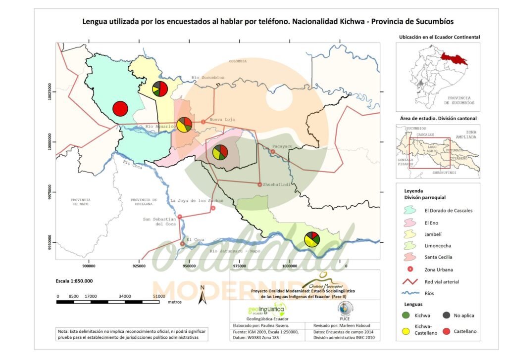 Cite: Haboud, M. (2014). Mapa de la lengua utilizada por los encuestados de la nacionalidad Kichwa al hablar por teléfono – Provincia de Sucumbíos. Programa Oralidad Modernidad/GeolingüísticaEcuador. https://oralidadmodernidad.org/cartografia-sucumbios-kichwa/