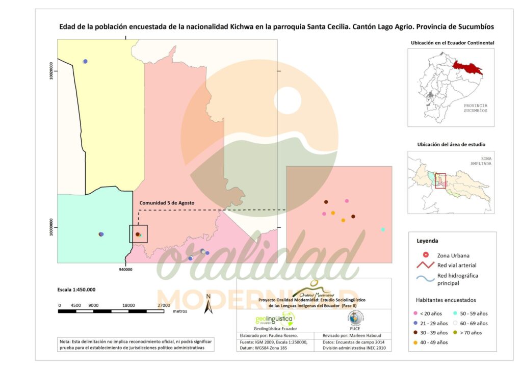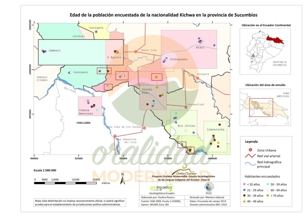 Cite: Haboud, M. (2014). Mapa de la edad de la población encuestada de la nacionalidad Kichwa en la parroquia Santa Cecilia del cantón Lago Agrio en la provincia de Sucumbíos. Programa Oralidad Modernidad/GeolingüísticaEcuador. https://oralidadmodernidad.org/cartografia-sucumbios-kichwa/
