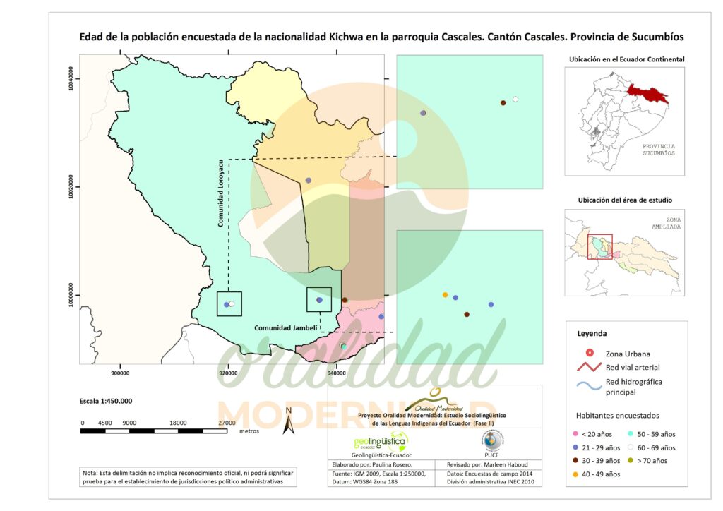Cite: Haboud, M. (2014). Mapa de la edad de la población encuestada de la nacionalidad Kichwa en la parroquia Cascales del cantón Cascales en la provincia de Sucumbíos. Programa Oralidad Modernidad/GeolingüísticaEcuador. https://oralidadmodernidad.org/cartografia-sucumbios-kichwa/