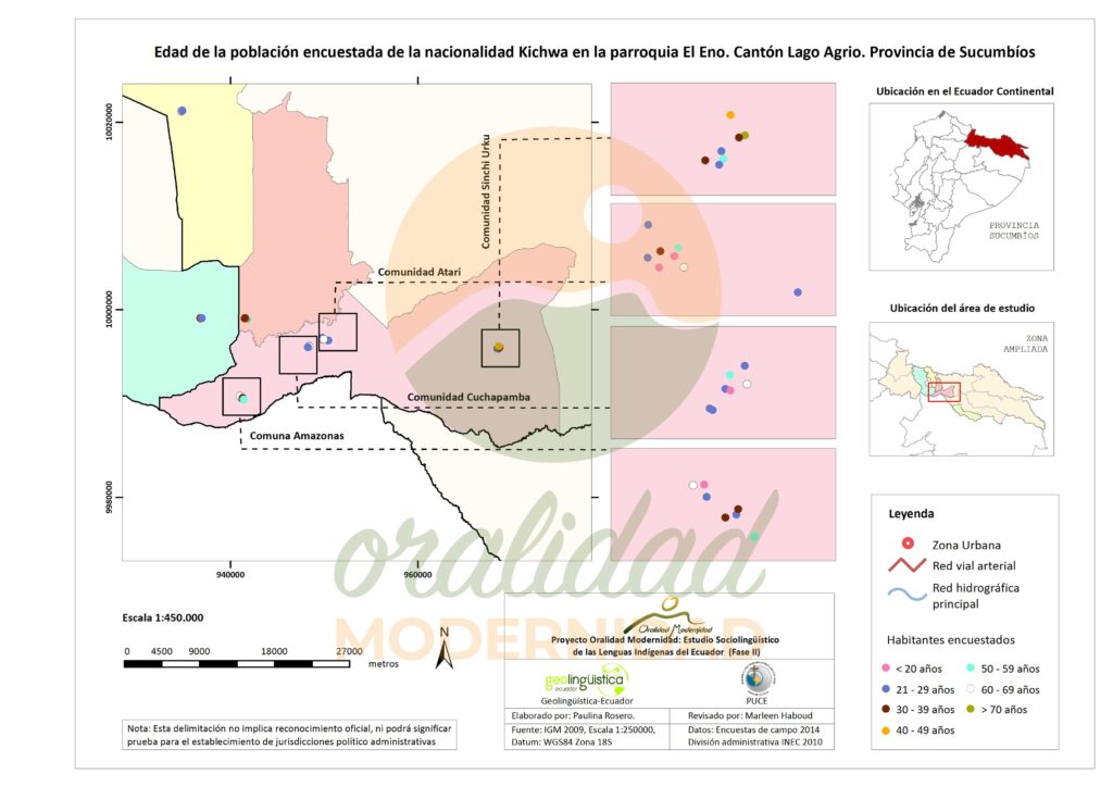 Cite: Haboud, M. (2014). Mapa de la edad de la población encuestada de la nacionalidad Kichwa en la parroquia El Eno del cantón Lago Agrio en la provincia de Sucumbíos. Programa Oralidad Modernidad/GeolingüísticaEcuador. https://oralidadmodernidad.org/cartografia-sucumbios-kichwa/