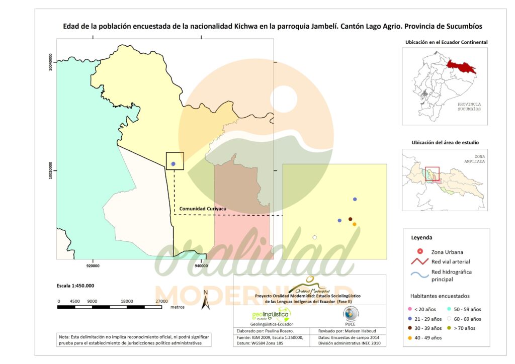 Cite: Haboud, M. (2014). Mapa de la edad de la población encuestada de la nacionalidad Kichwa en la parroquia Jambelí del cantón Lago Agrio en la provincia de Sucumbíos. Programa Oralidad Modernidad/GeolingüísticaEcuador. https://oralidadmodernidad.org/cartografia-sucumbios-kichwa/