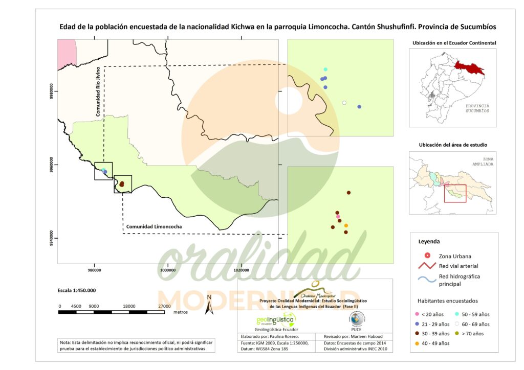 Cite: Haboud, M. (2014). Mapa de la edad de la población encuestada de la nacionalidad Kichwa en la parroquia Limoncocha del cantón Shushufindi en la provincia de Sucumbíos. Programa Oralidad Modernidad/GeolingüísticaEcuador. https://oralidadmodernidad.org/cartografia-sucumbios-kichwa/