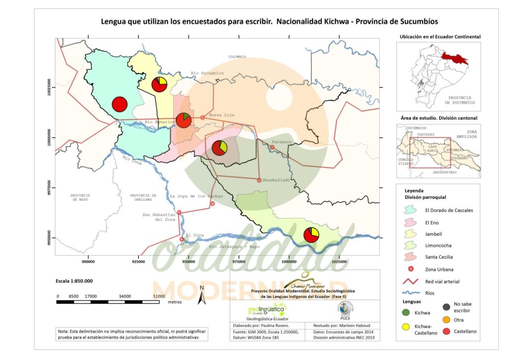 Cite: Haboud, M. (2014). Mapa de la lengua que utilizan los encuestados de la nacionalidad Kichwa para escribir – Provincia de Sucumbíos. Programa Oralidad Modernidad/GeolingüísticaEcuador. https://oralidadmodernidad.org/cartografia-sucumbios-kichwa/