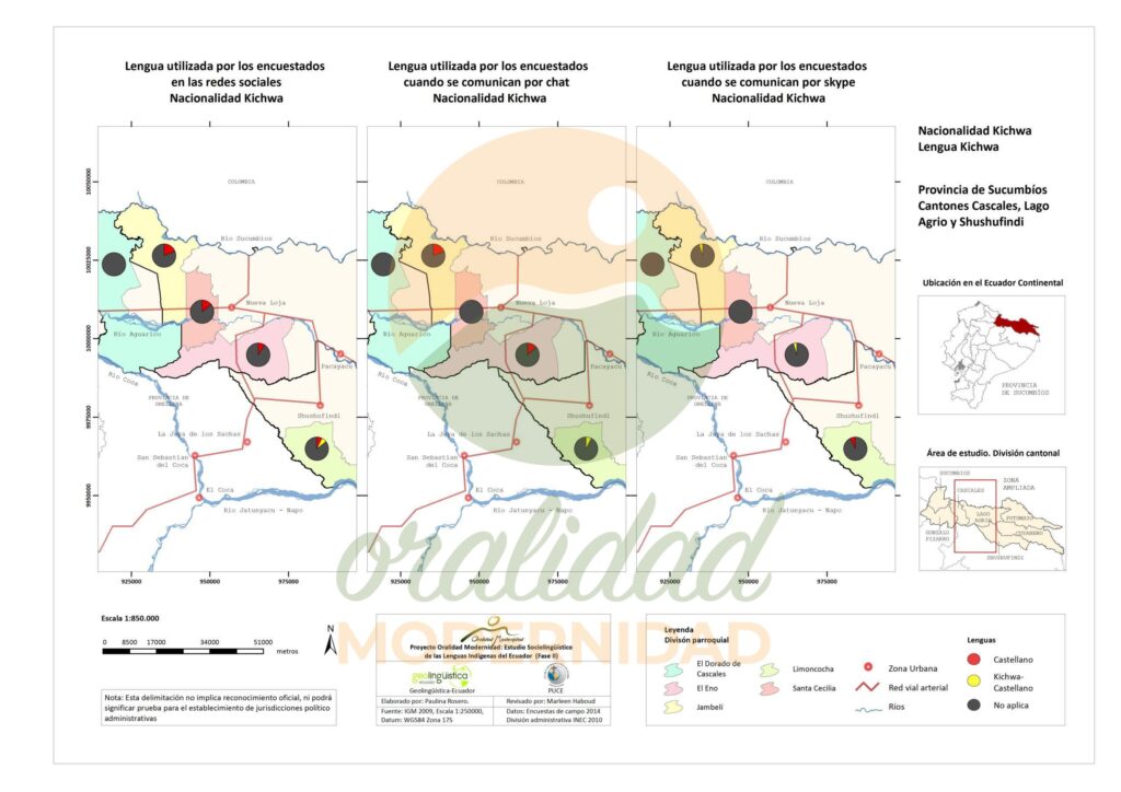 Cite: Haboud, M. (2014). Mapa de la lengua utilizada por los encuestados de la nacionalidad Kichwa en las redes sociales, cuando se comunican por chat y cuando se comunican por skype – Provincia de Sucumbíos. Programa Oralidad Modernidad/GeolingüísticaEcuador. https://oralidadmodernidad.org/cartografia-sucumbios-kichwa/