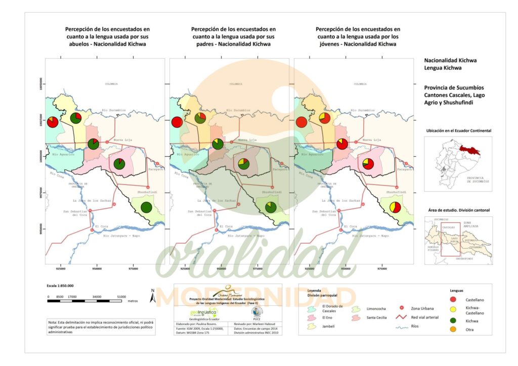 Cite: Haboud, M. (2014). Mapa de la percepción de los encuestados de la nacionalidad Kichwa en cuanto a la lengua usada por sus abuelos, por sus padres y por los jóvenes en la provincia de Sucumbíos – Lengua Kichwa. Programa Oralidad Modernidad/GeolingüísticaEcuador. https://oralidadmodernidad.org/cartografia-sucumbios-kichwa/
