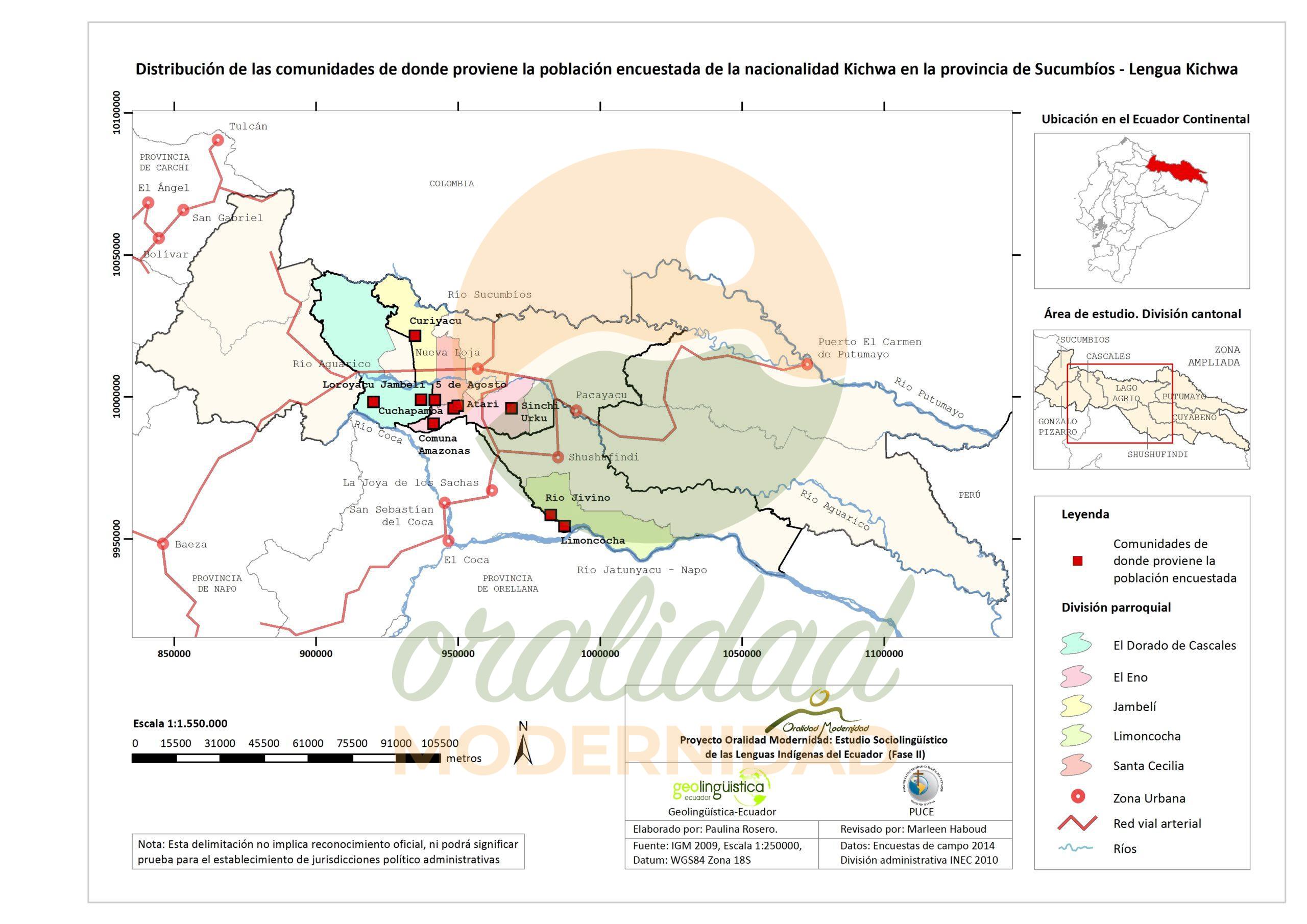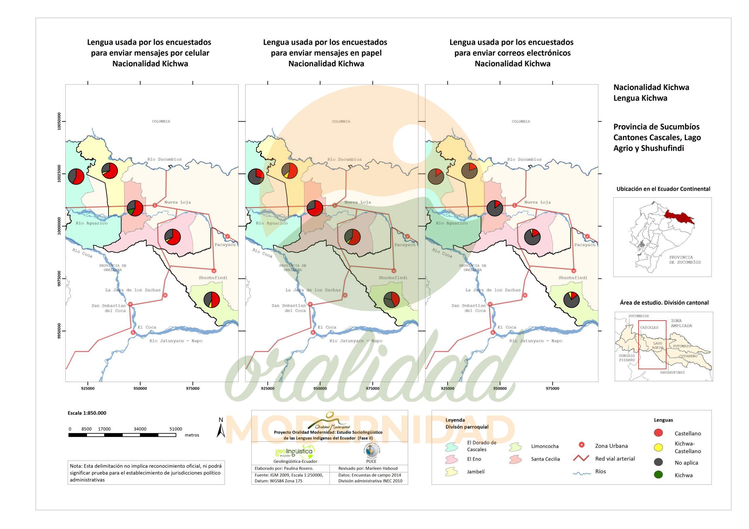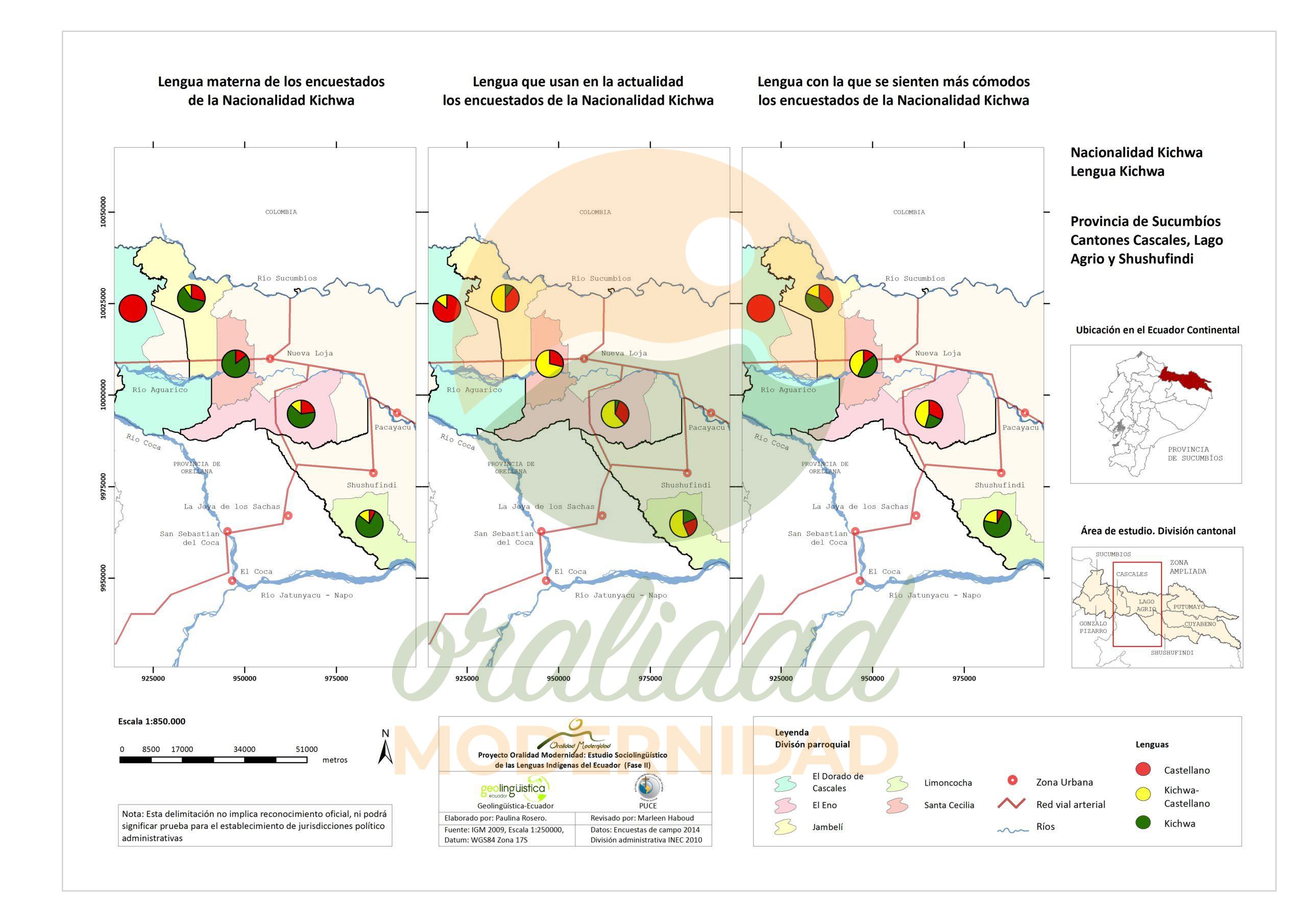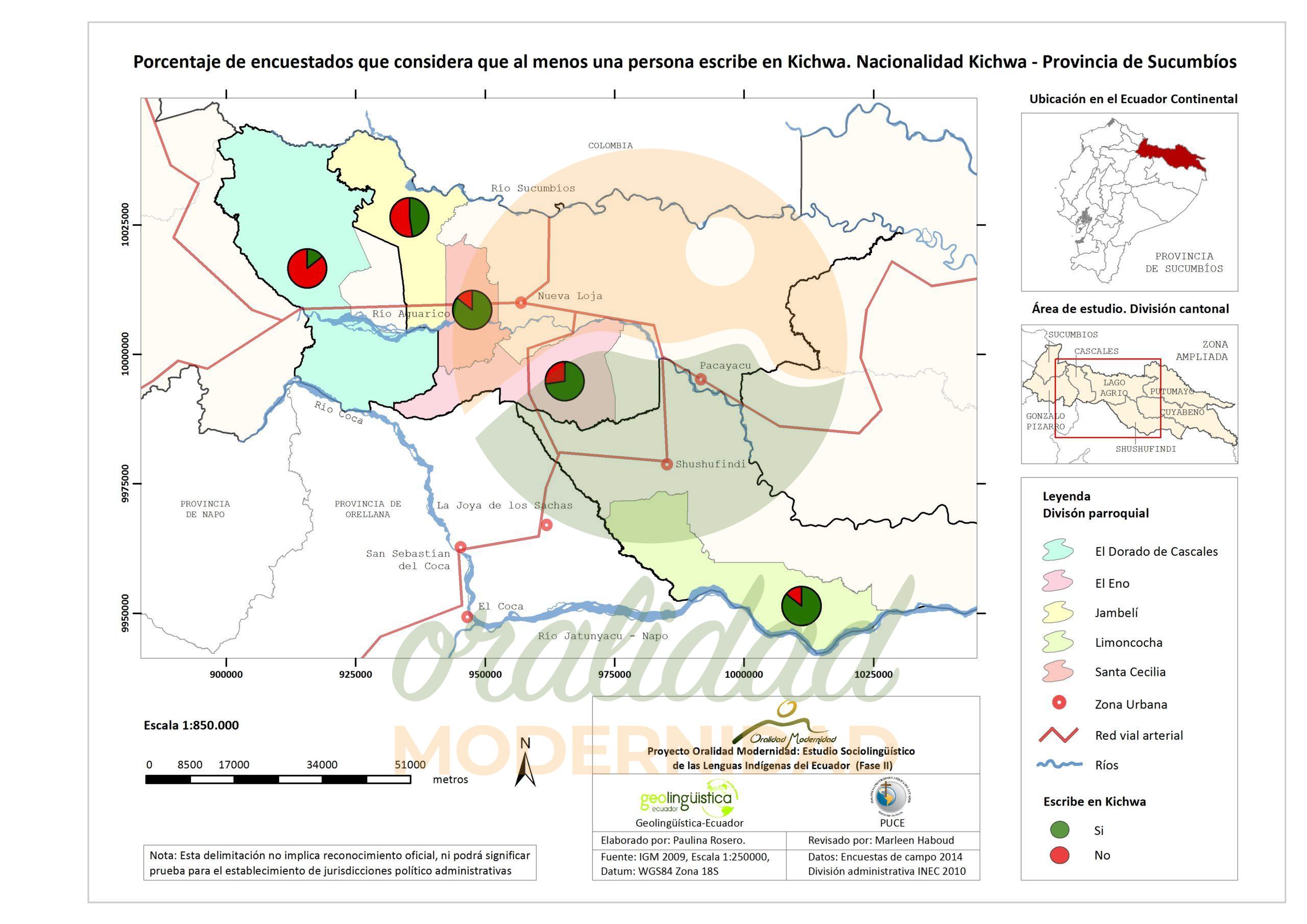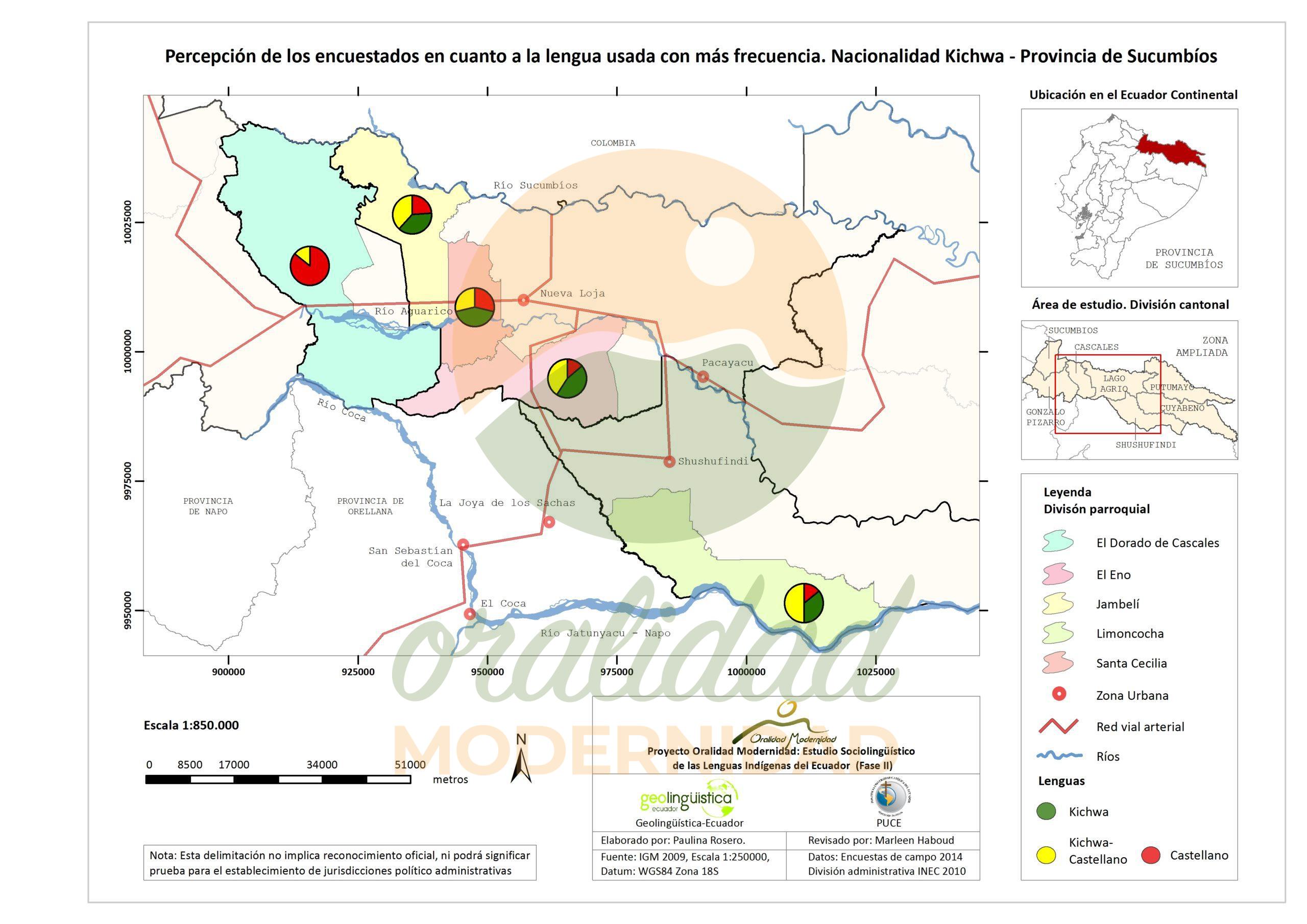 Cite: Haboud, M. (2014). Mapa de la lengua que utilizan los encuestados de la nacionalidad Kichwa para escribir – Provincia de Sucumbíos. Programa Oralidad Modernidad/GeolingüísticaEcuador. https://oralidadmodernidad.org/cartografia-sucumbios-kichwa/
