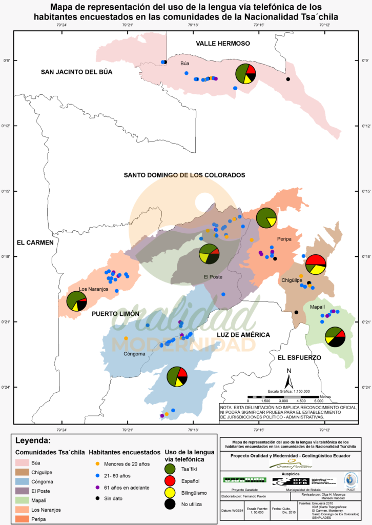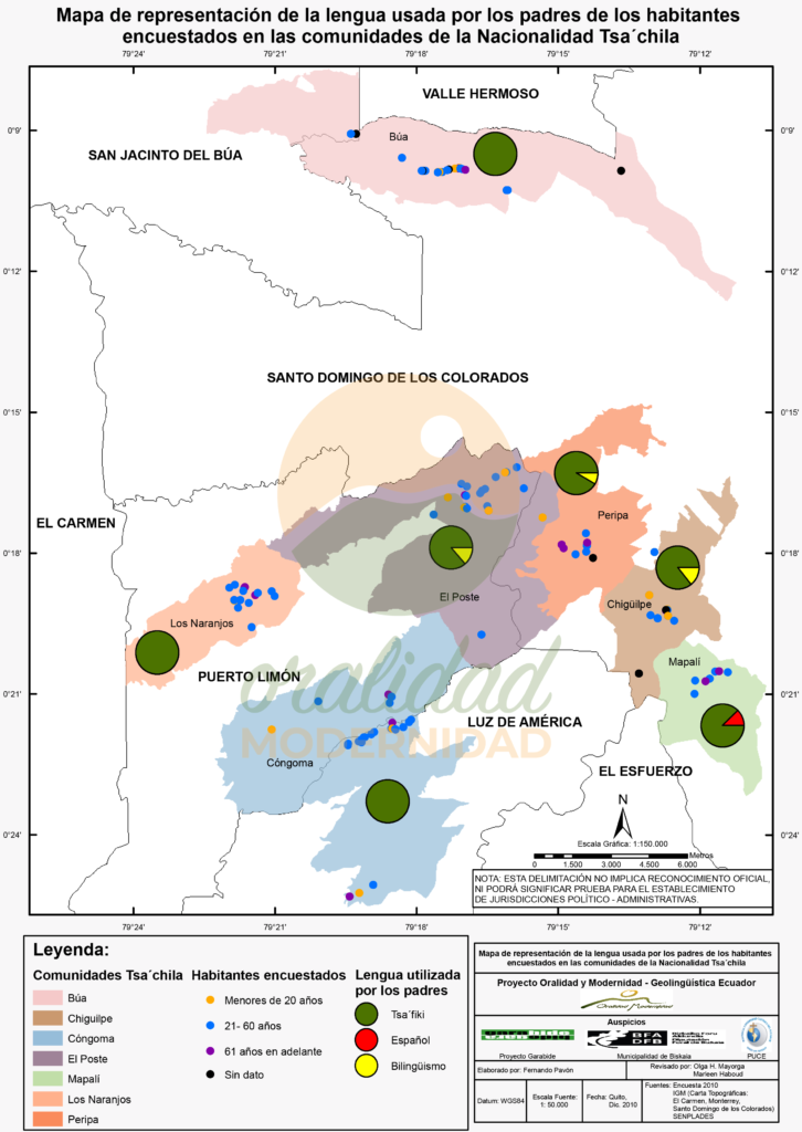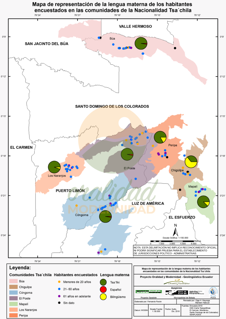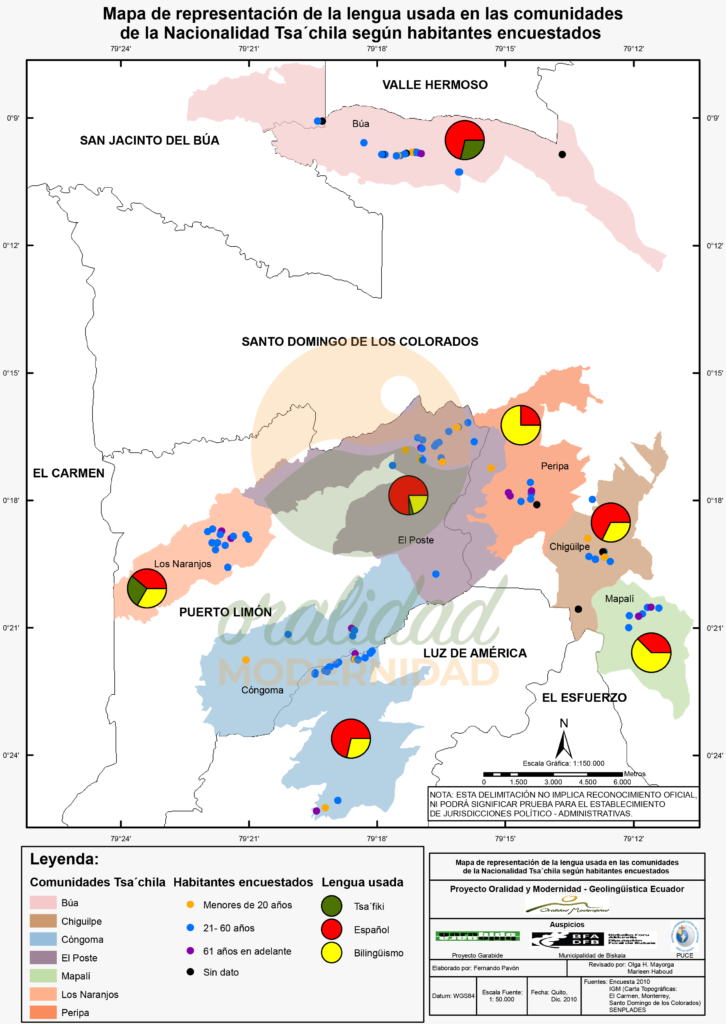 Cite: Haboud, M. (2010). Mapa de representación de la lengua usada en las comunidades de la Nacionalidad Tsa’chila según habitantes encuestados. Programa Oralidad Modernidad/GeolingüísticaEcuador. https://oralidadmodernidad.org/cartografia-tsachila/