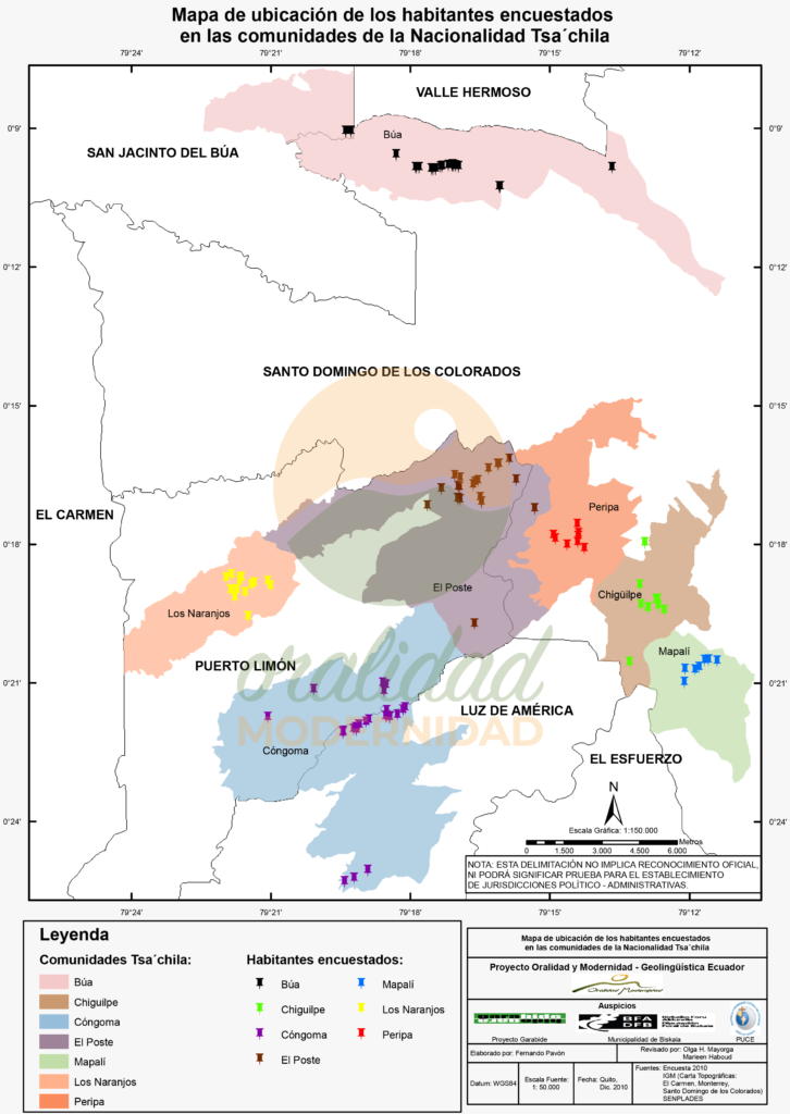 Cite: Haboud, M. (2010). Mapa de ubicación de los habitantes encuestados en las comunidades de la Nacionalidad Tsa’chila. Programa Oralidad Modernidad/GeolingüísticaEcuador. https://oralidadmodernidad.org/cartografia-tsachila/