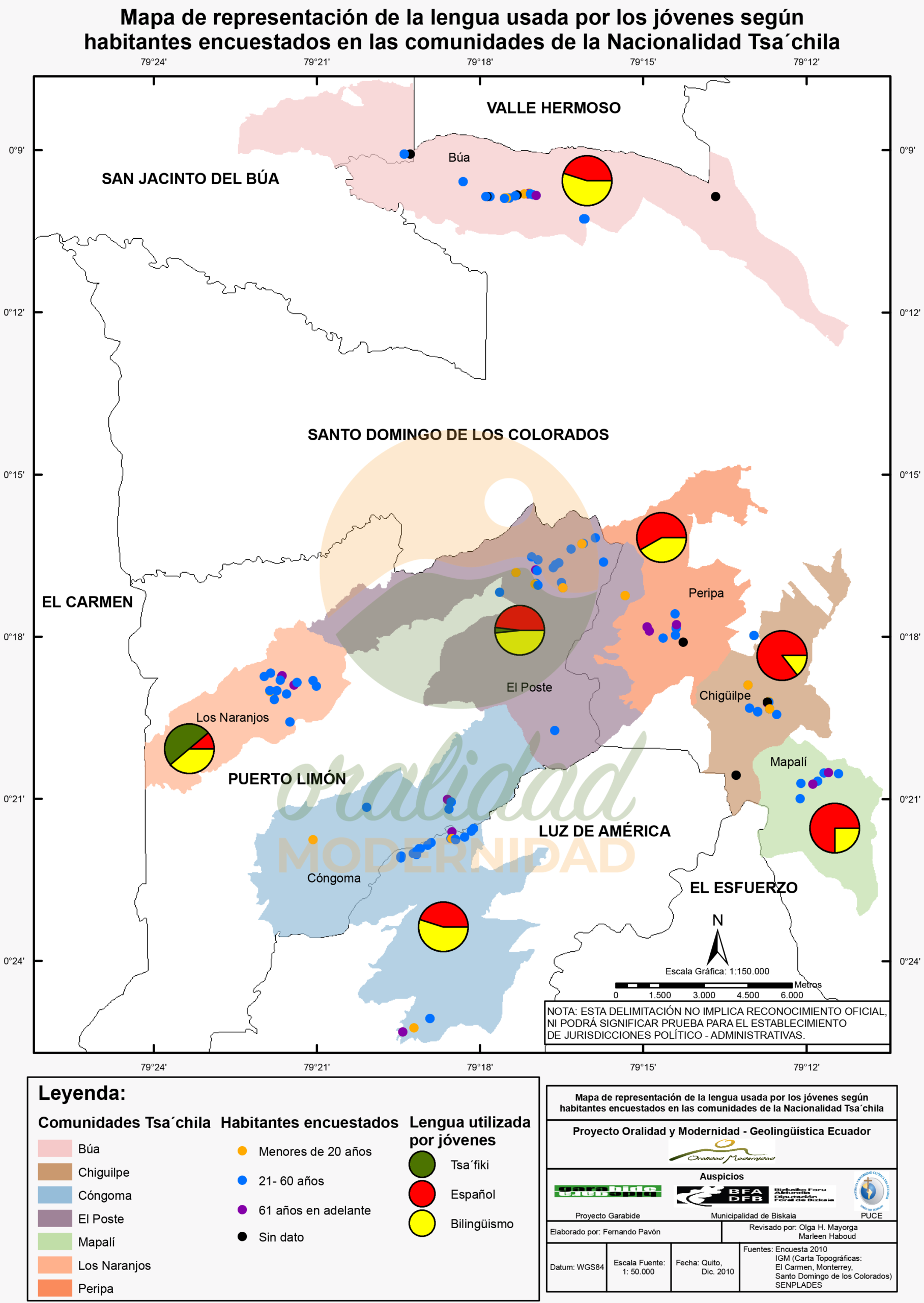 Cite: Haboud, M. (2010). Mapa de representación de lalengua usada por los jóvenes según los habitantes encuestados en las comunidades de la Nacionalidad Tsa’chila. Programa Oralidad Modernidad/GeolingüísticaEcuador. https://oralidadmodernidad.org/cartografia-tsachila/