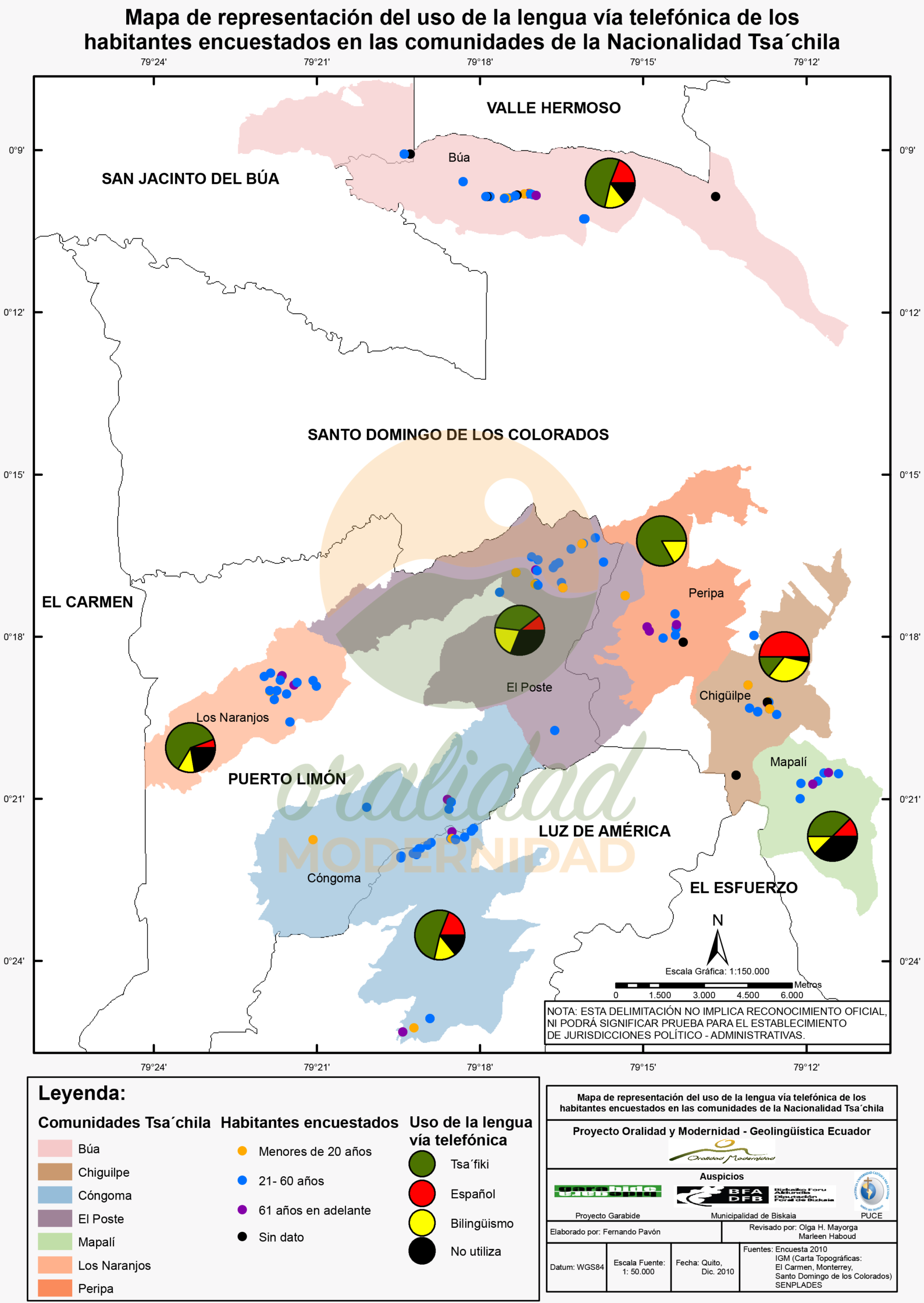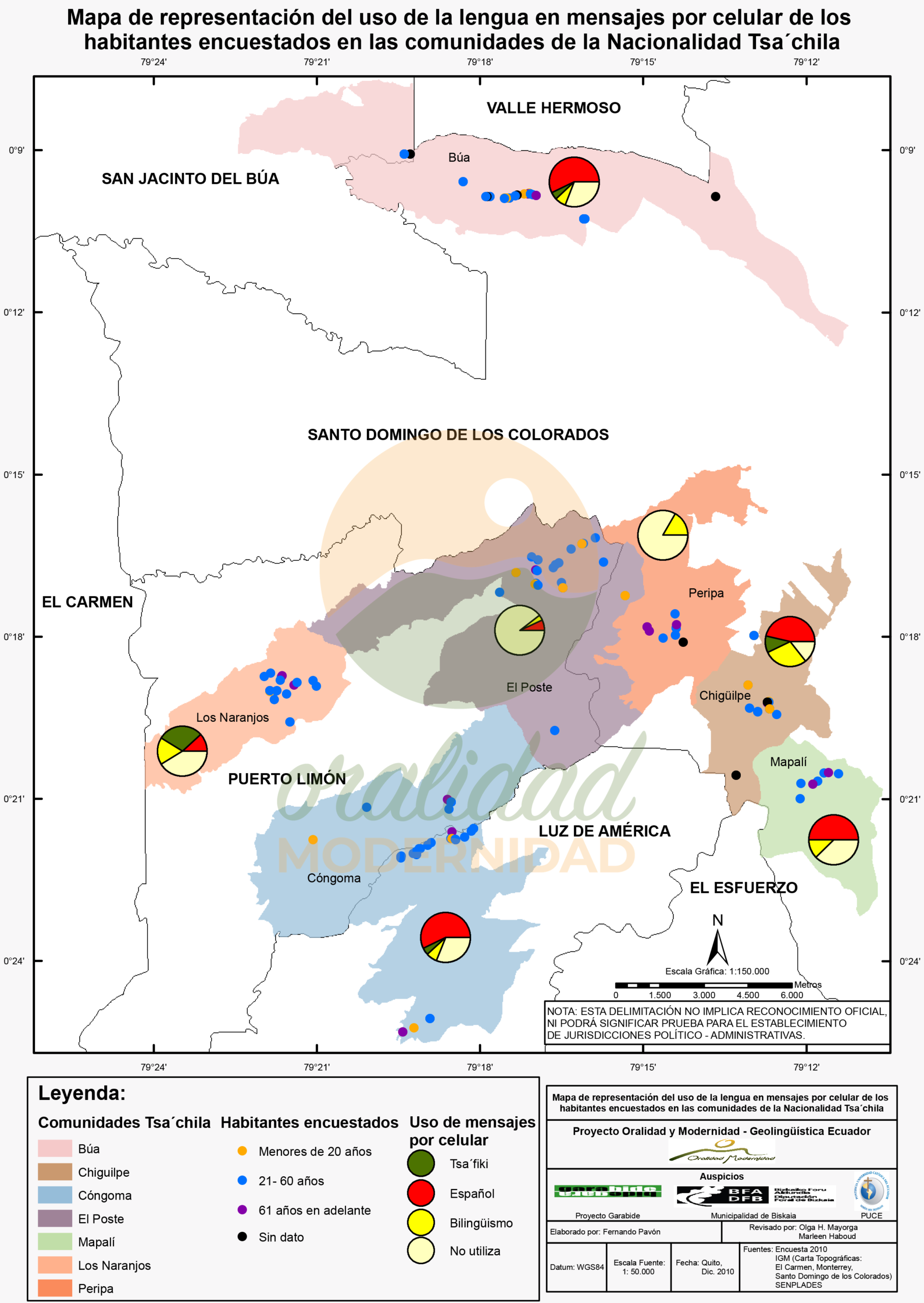 Cite: Haboud, M. (2010). Mapa de representación del uso de la lengua en mensajes por celular de los habitantes encuestados en las comunidades de la Nacionalidad Tsa’chila. Programa Oralidad Modernidad/GeolingüísticaEcuador. https://oralidadmodernidad.org/cartografia-tsachila/