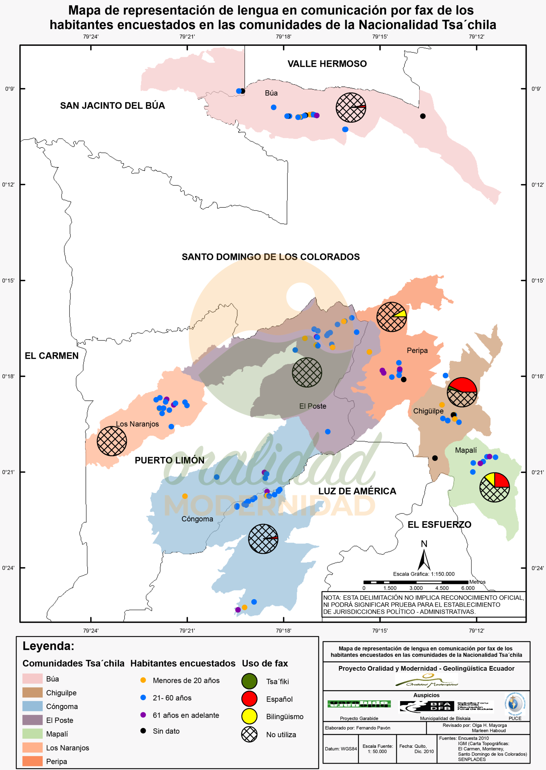 Cite: Haboud, M. (2010). Mapa de representación de la lengua en comunicación por fax de los habitantes encuestados en las comunidades de la Nacionalidad Tsa’chila. Programa Oralidad Modernidad/GeolingüísticaEcuador. https://oralidadmodernidad.org/cartografia-tsachila/