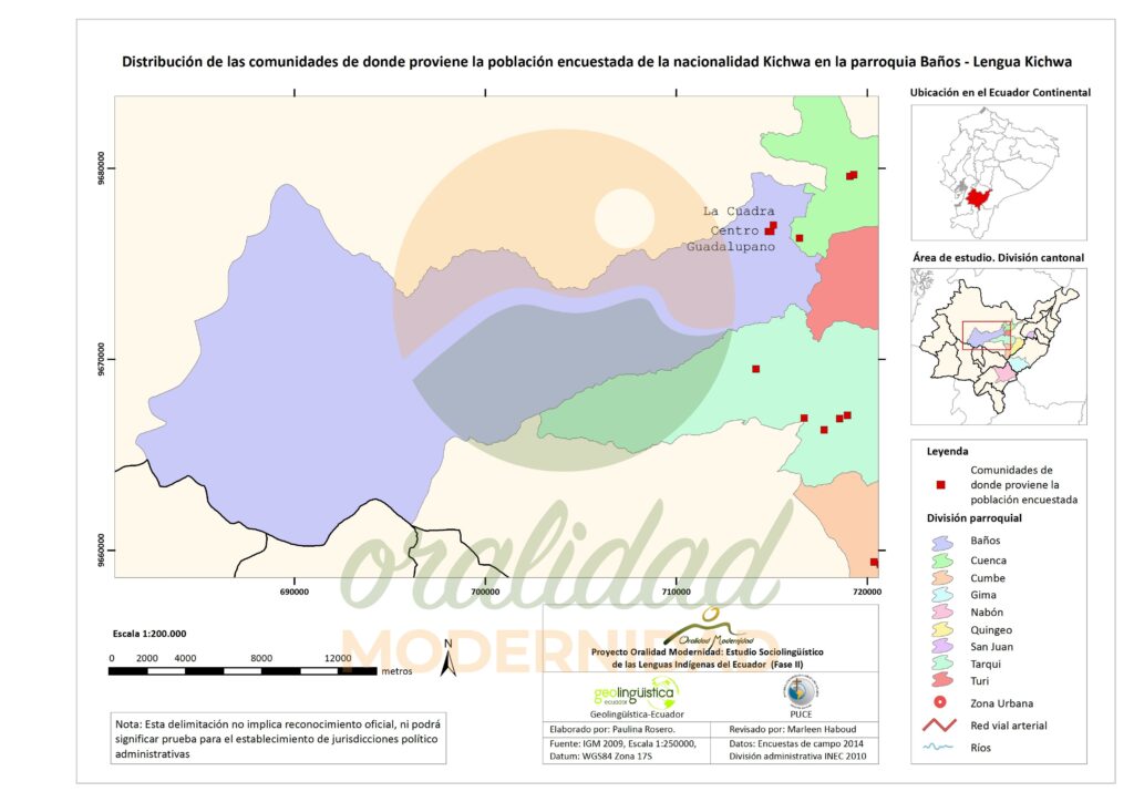 Cite así: Haboud, M. (2014). Mapa de la distribución de las comunidades de donde proviene la población encuestada de la nacionalidad Kichwa en la parroquia Baños – Lengua Kichwa. Programa Oralidad Modernidad/GeolingüísticaEcuador. https://oralidadmodernidad.org/muestra-parroquias-azuay/