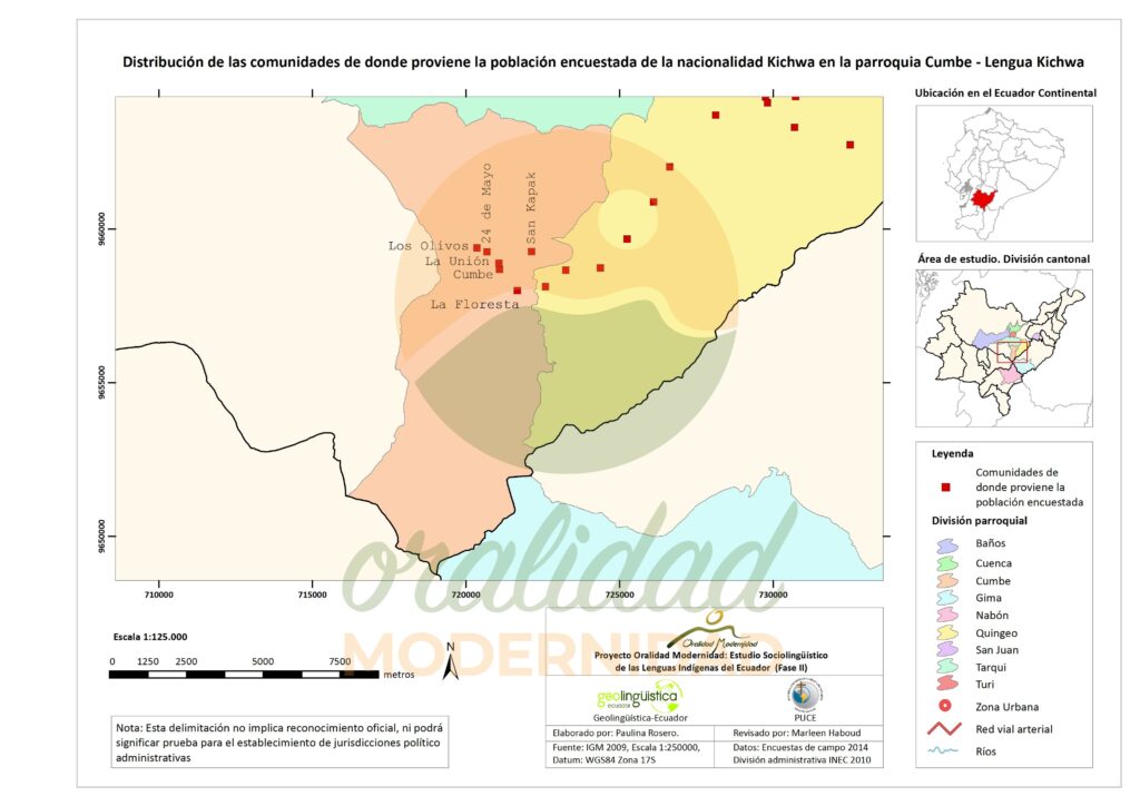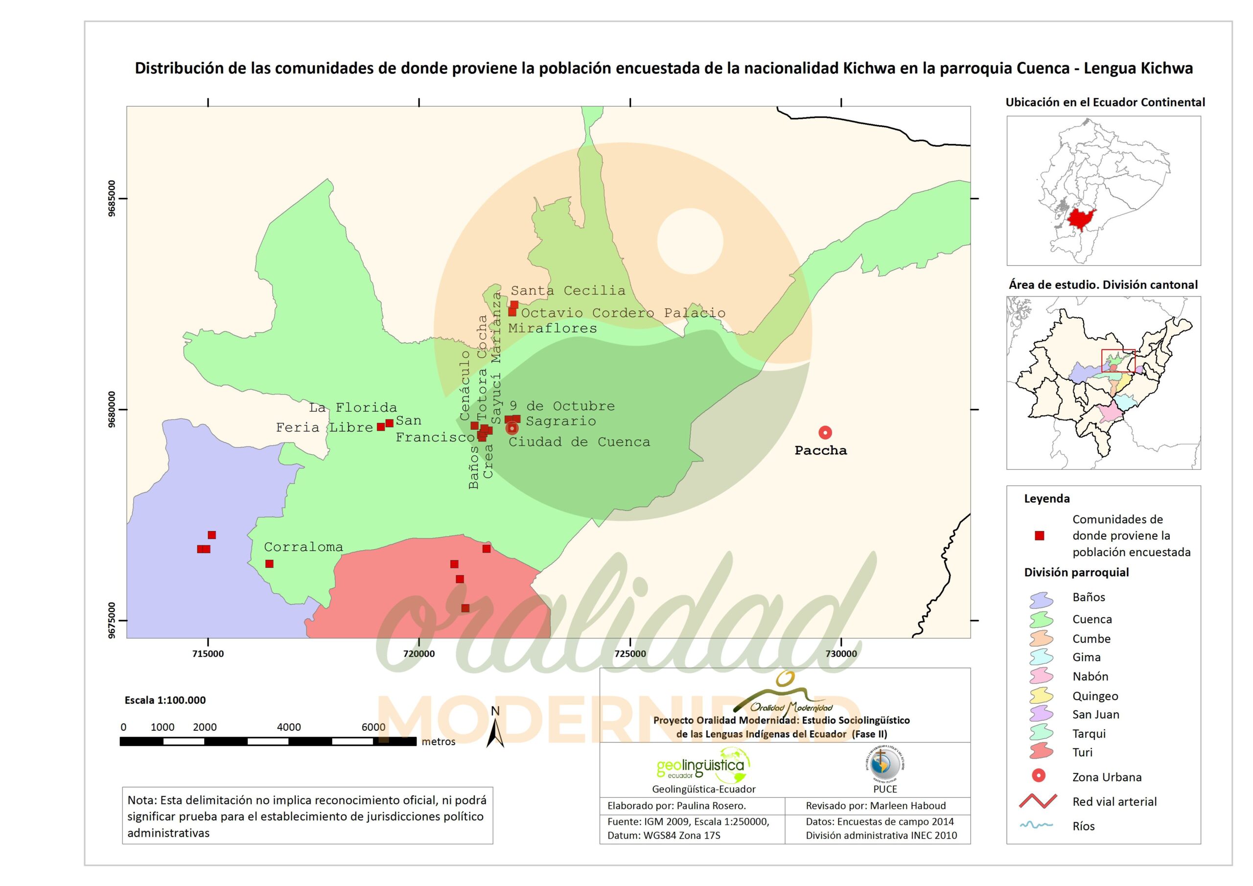 Cite así: Haboud, M. (2014). Mapa de la distribución de las comunidades de donde proviene la población encuestada de la nacionalidad Kichwa en la parroquia Cuenca – Lengua Kichwa. Programa Oralidad Modernidad/GeolingüísticaEcuador. https://oralidadmodernidad.org/muestra-parroquias-azuay/