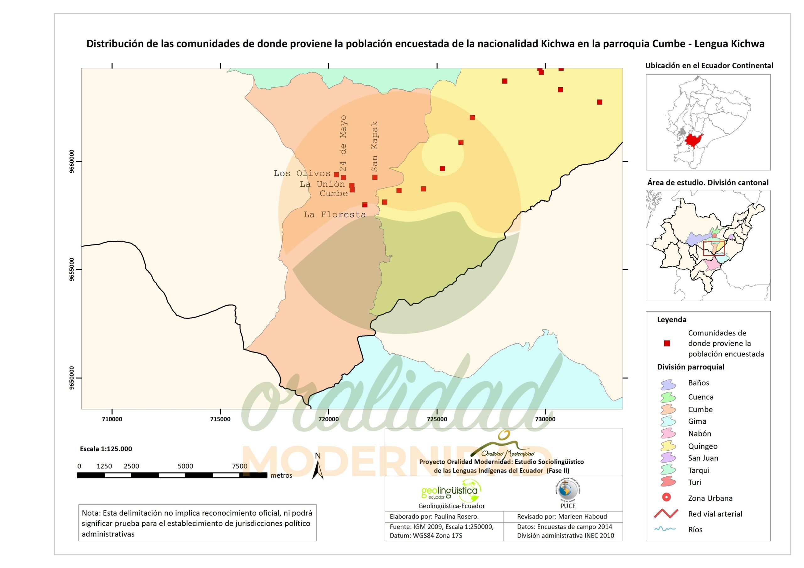 Cite así: Haboud, M. (2014). Mapa de la distribución de las comunidades de donde proviene la población encuestada de la nacionalidad Kichwa en la parroquia Cumbe – Lengua Kichwa. Programa Oralidad Modernidad/GeolingüísticaEcuador. https://oralidadmodernidad.org/muestra-parroquias-azuay/
