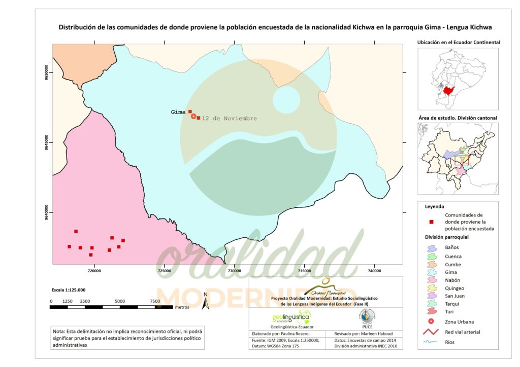 Cite así: Haboud, M. (2014). Mapa de la distribución de las comunidades de donde proviene la población encuestada de la nacionalidad Kichwa en la parroquia Gima – Lengua Kichwa. Programa Oralidad Modernidad/GeolingüísticaEcuador. https://oralidadmodernidad.org/muestra-parroquias-azuay/