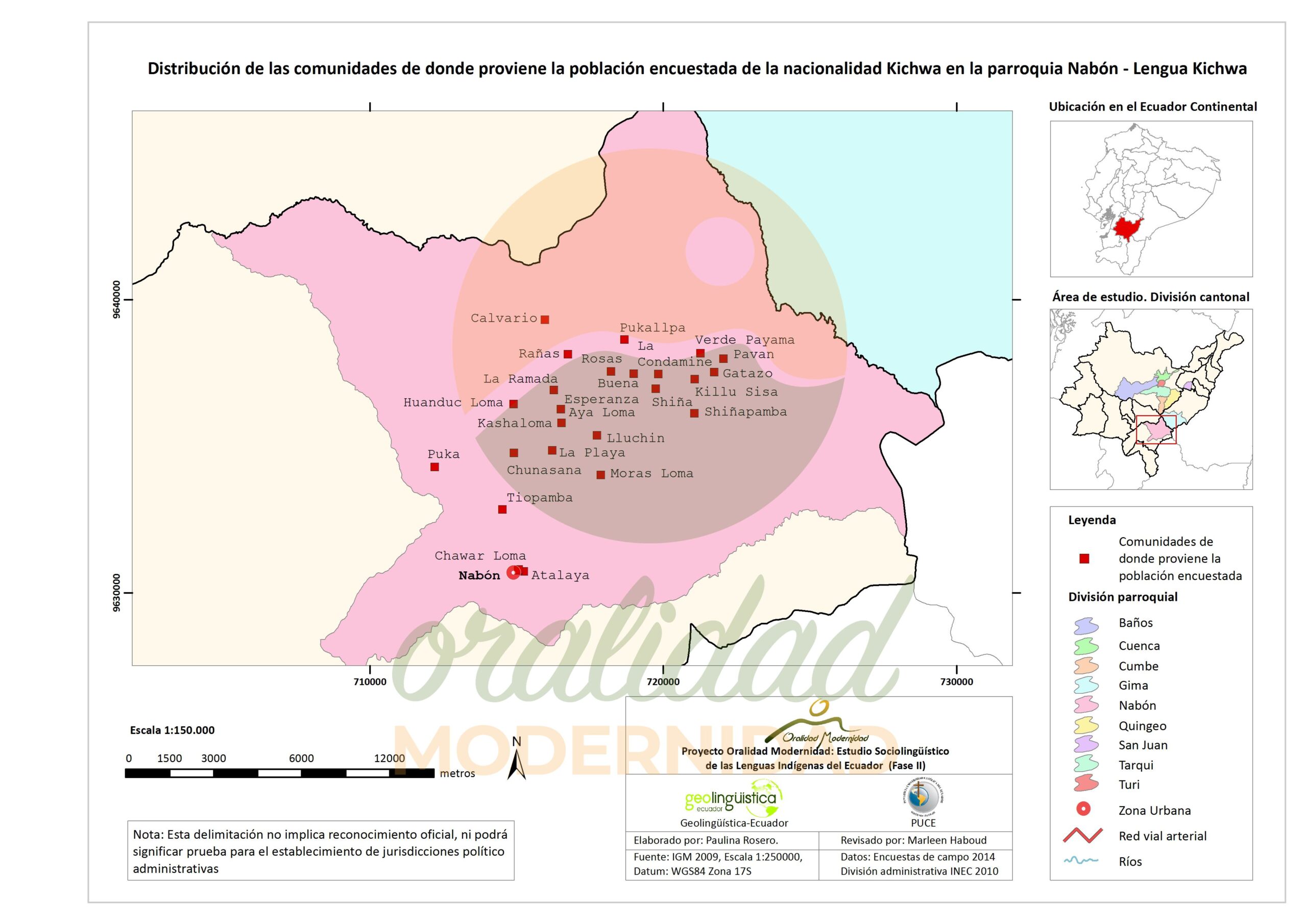 Cite así: Haboud, M. (2014). Mapa de la distribución de las comunidades de donde proviene la población encuestada de la nacionalidad Kichwa en la parroquia Nabón – Lengua Kichwa. Programa Oralidad Modernidad/GeolingüísticaEcuador. https://oralidadmodernidad.org/muestra-parroquias-azuay/