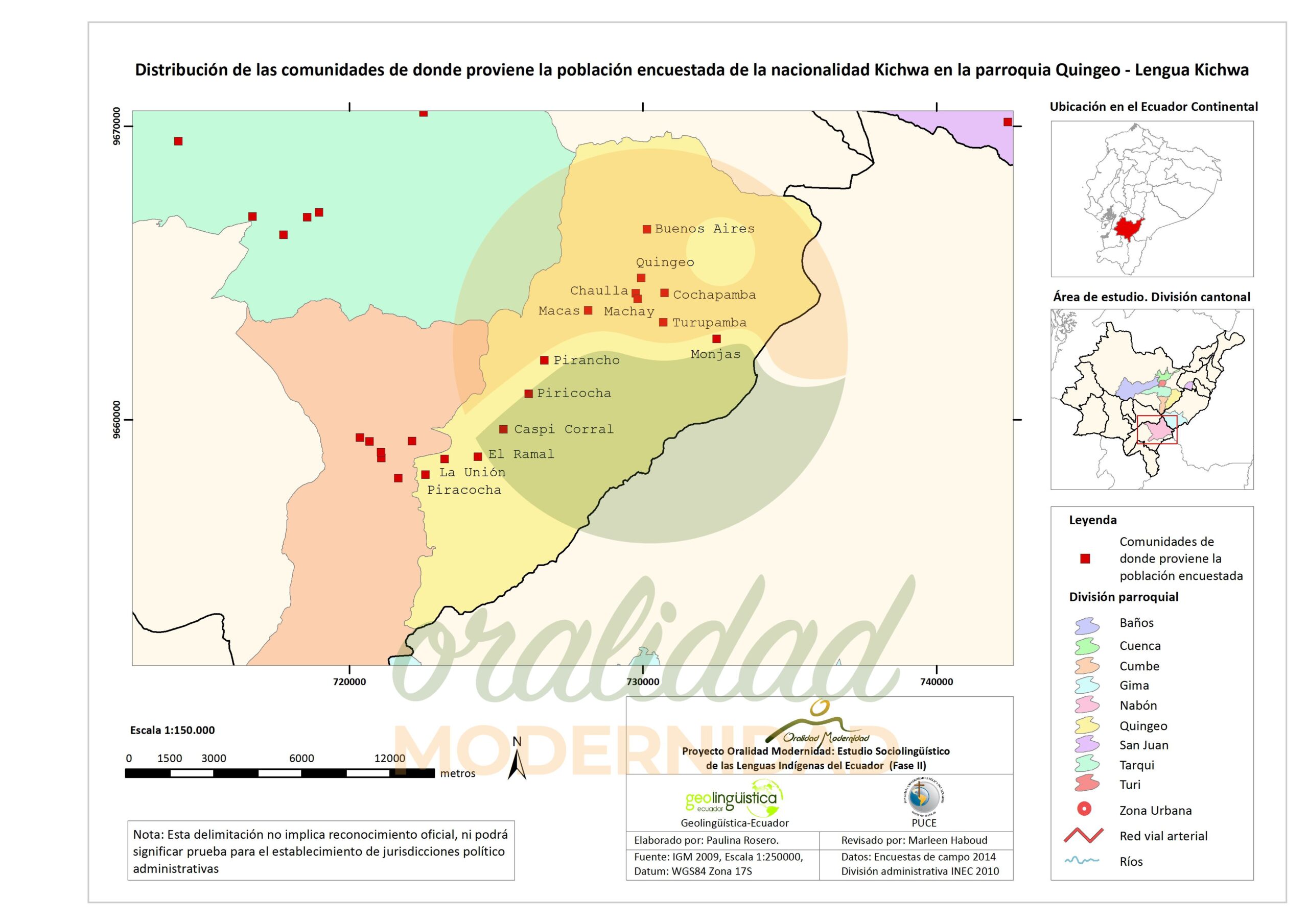 Cite así: Haboud, M. (2014). Mapa de la distribución de las comunidades de donde proviene la población encuestada de la nacionalidad Kichwa en la parroquia Quingeo – Lengua Kichwa. Programa Oralidad Modernidad/GeolingüísticaEcuador. https://oralidadmodernidad.org/muestra-parroquias-azuay/