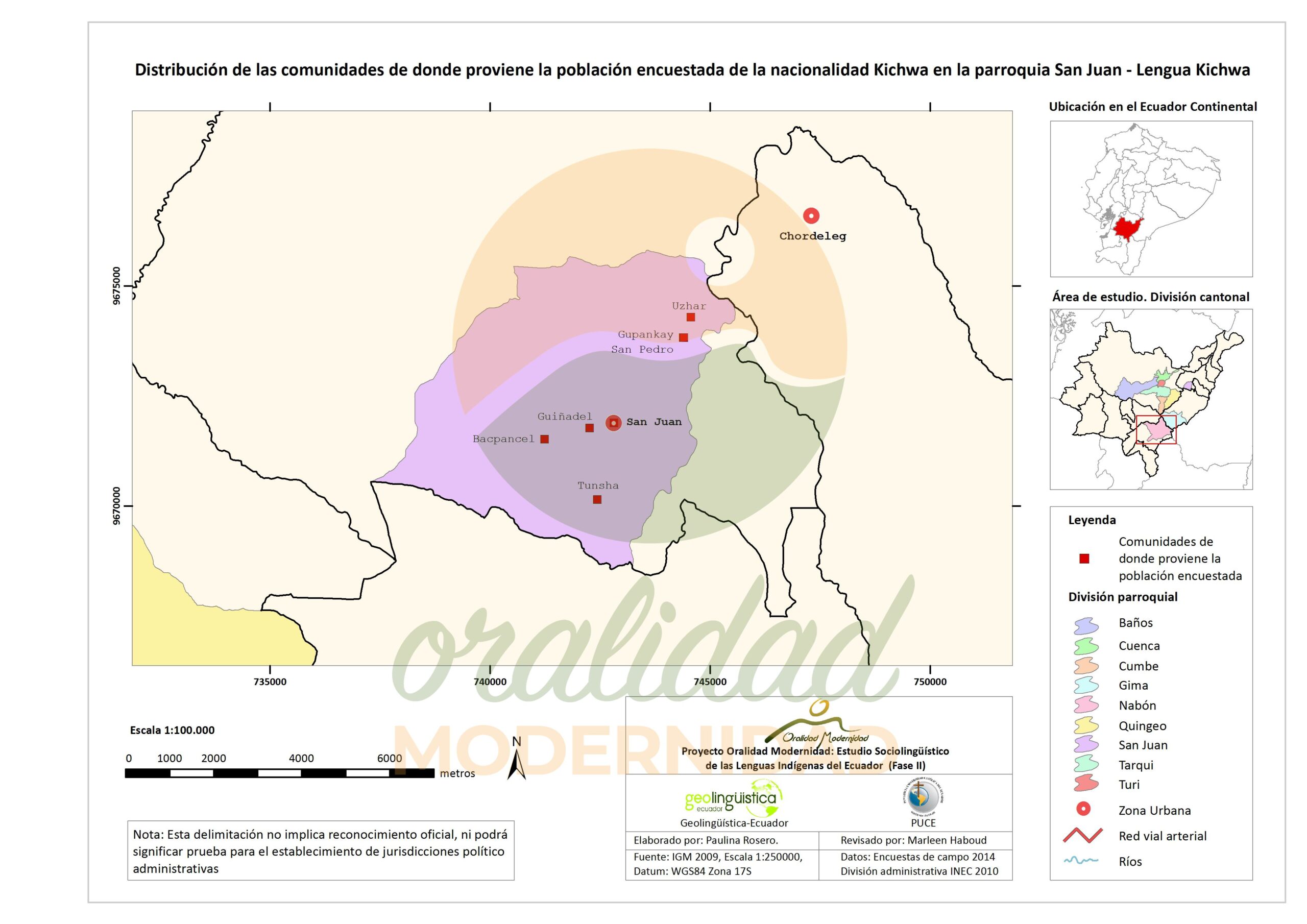 Cite así: Haboud, M. (2014). Mapa de la distribución de las comunidades de donde proviene la población encuestada de la nacionalidad Kichwa en la parroquia San Juan – Lengua Kichwa. Programa Oralidad Modernidad/GeolingüísticaEcuador. https://oralidadmodernidad.org/muestra-parroquias-azuay/