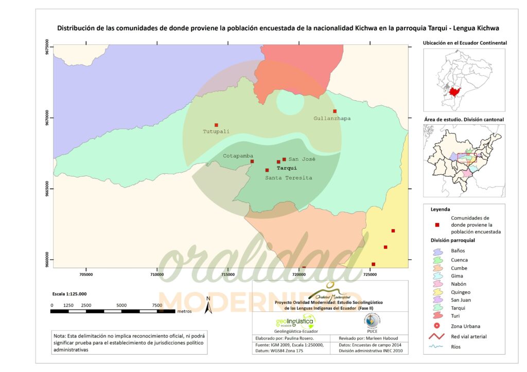 Cite así: Haboud, M. (2014). Mapa de la distribución de las comunidades de donde proviene la población encuestada de la nacionalidad Kichwa en la parroquia Tarqui – Lengua Kichwa. Programa Oralidad Modernidad/GeolingüísticaEcuador. https://oralidadmodernidad.org/muestra-parroquias-azuay/