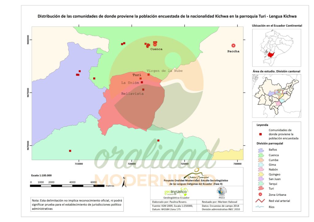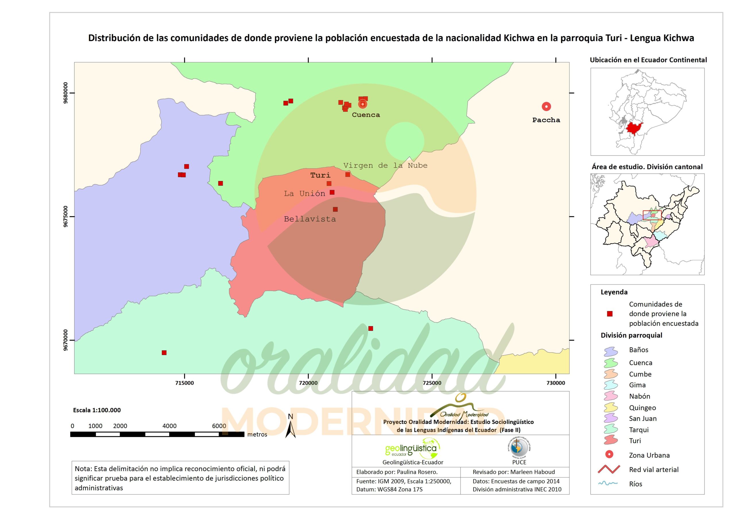 Cite así: Haboud, M. (2014). Mapa de la distribución de las comunidades de donde proviene la población encuestada de la nacionalidad Kichwa en la parroquia Turi – Lengua Kichwa. Programa Oralidad Modernidad/GeolingüísticaEcuador. https://oralidadmodernidad.org/muestra-parroquias-azuay/