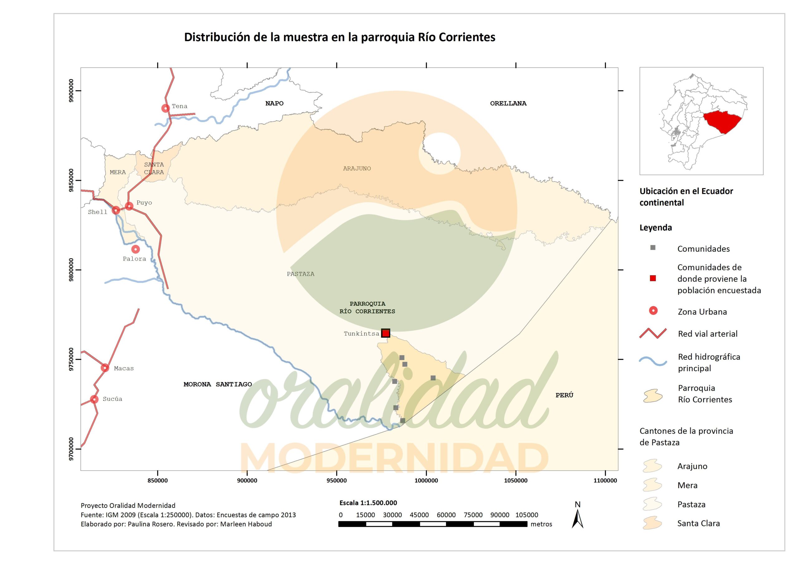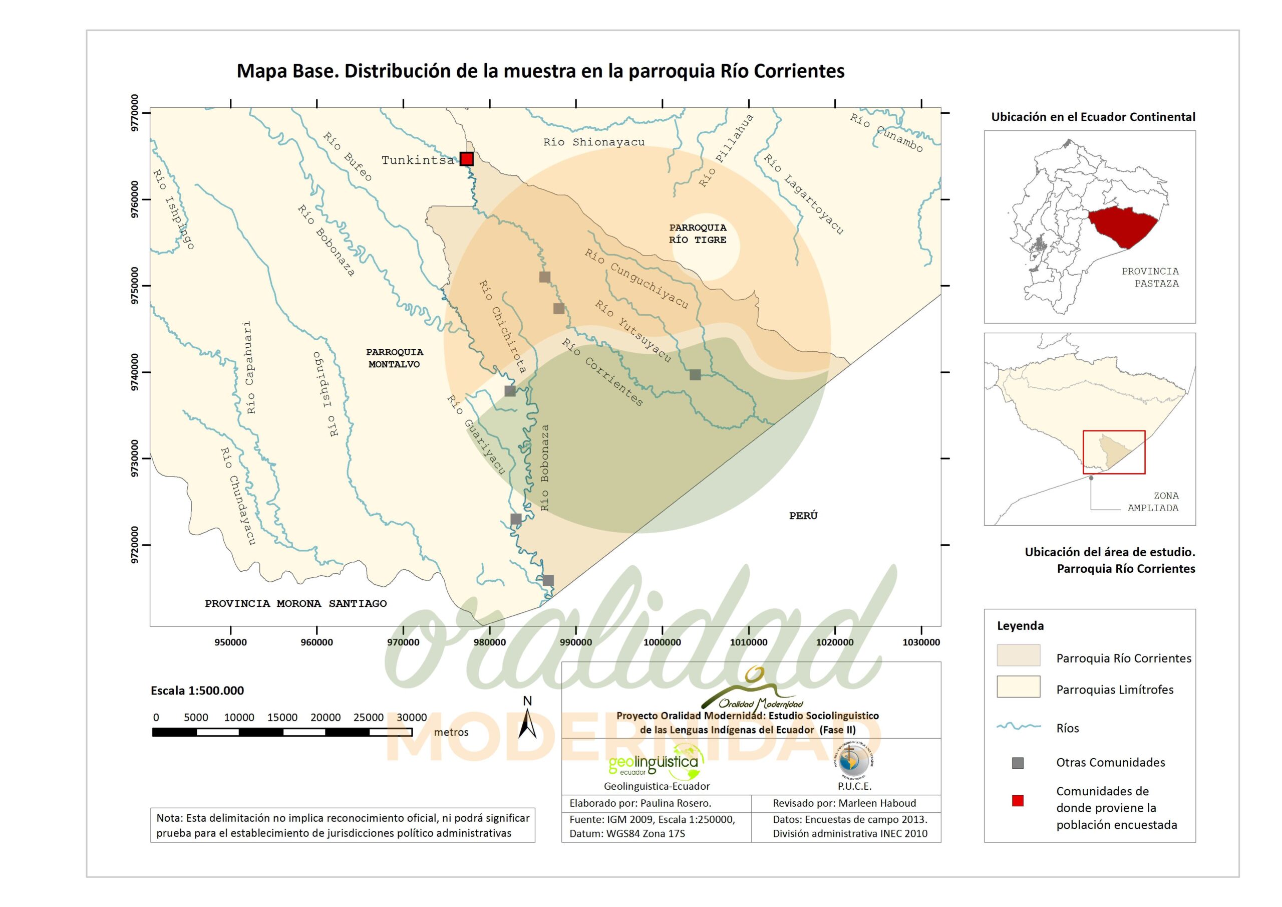 Cite: Haboud, M. (2013). Acercamiento del mapa de la distribución de la muestra de los encuestados de la nacionalidad Shiwiar en la parroquia Río Corrientes. Programa Oralidad Modernidad/GeolingüísticaEcuador. https://oralidadmodernidad.org/parroquia-rio-corrientes/