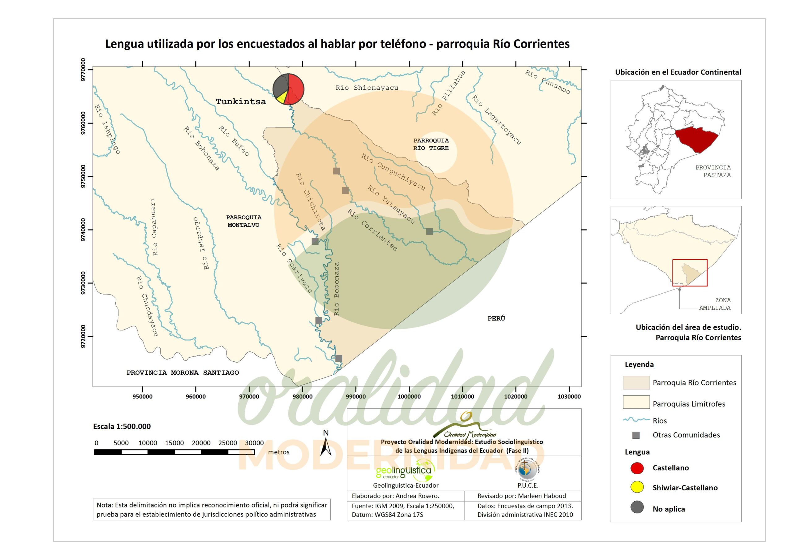 Cite: Haboud, M. (2013). Mapa de la lengua utilizada por los encuestados de la nacionalidad Shiwiar al hablar por teléfono – Parroquia Río Corrientes. Programa Oralidad Modernidad/GeolingüísticaEcuador. https://oralidadmodernidad.org/parroquia-rio-corrientes/