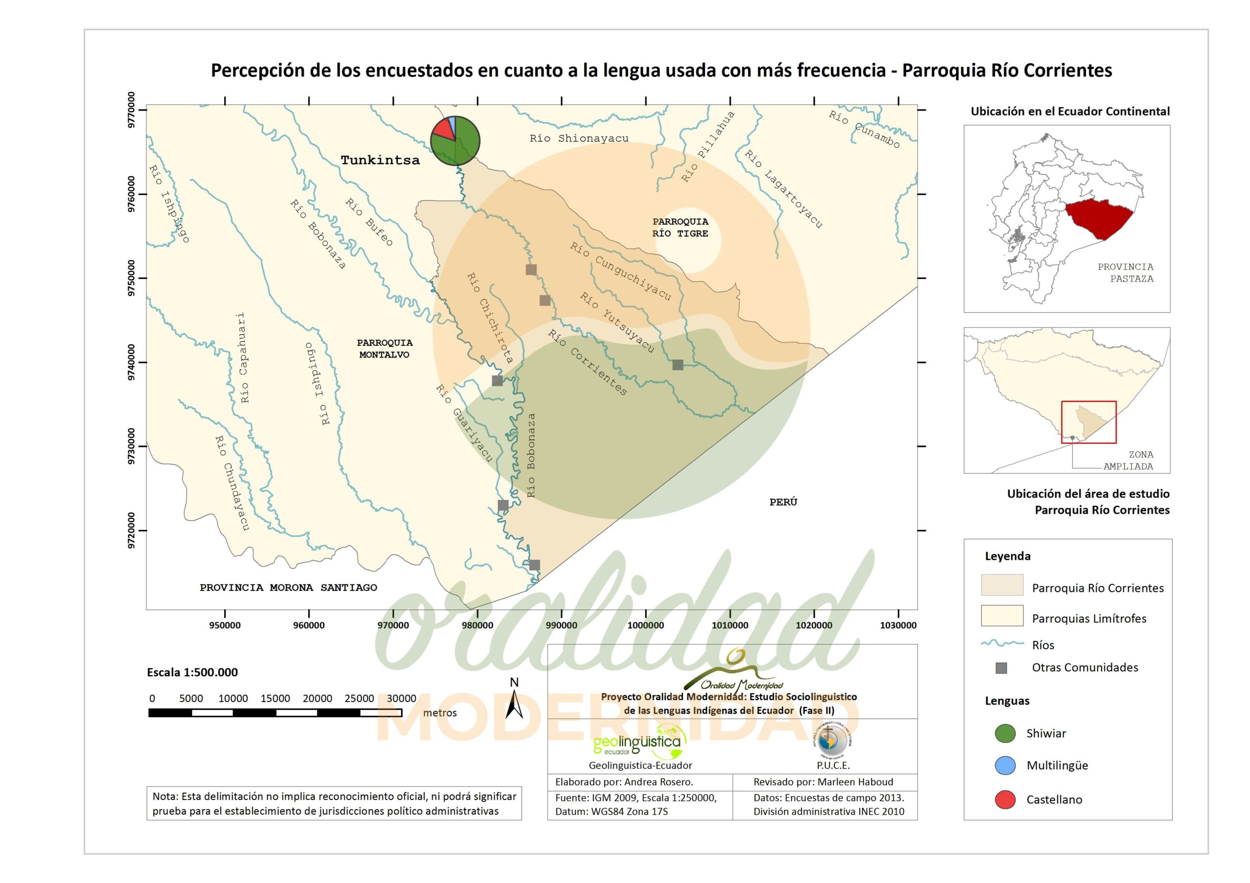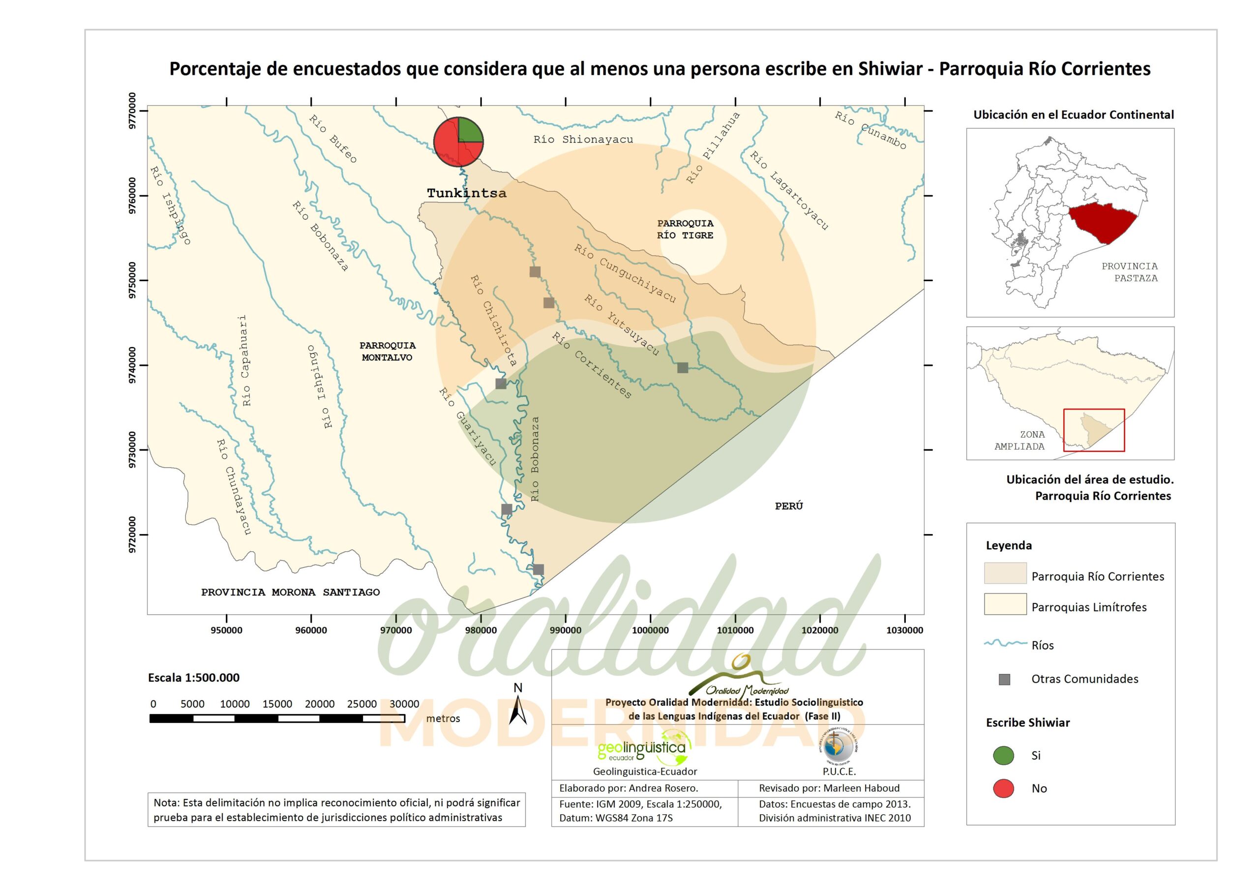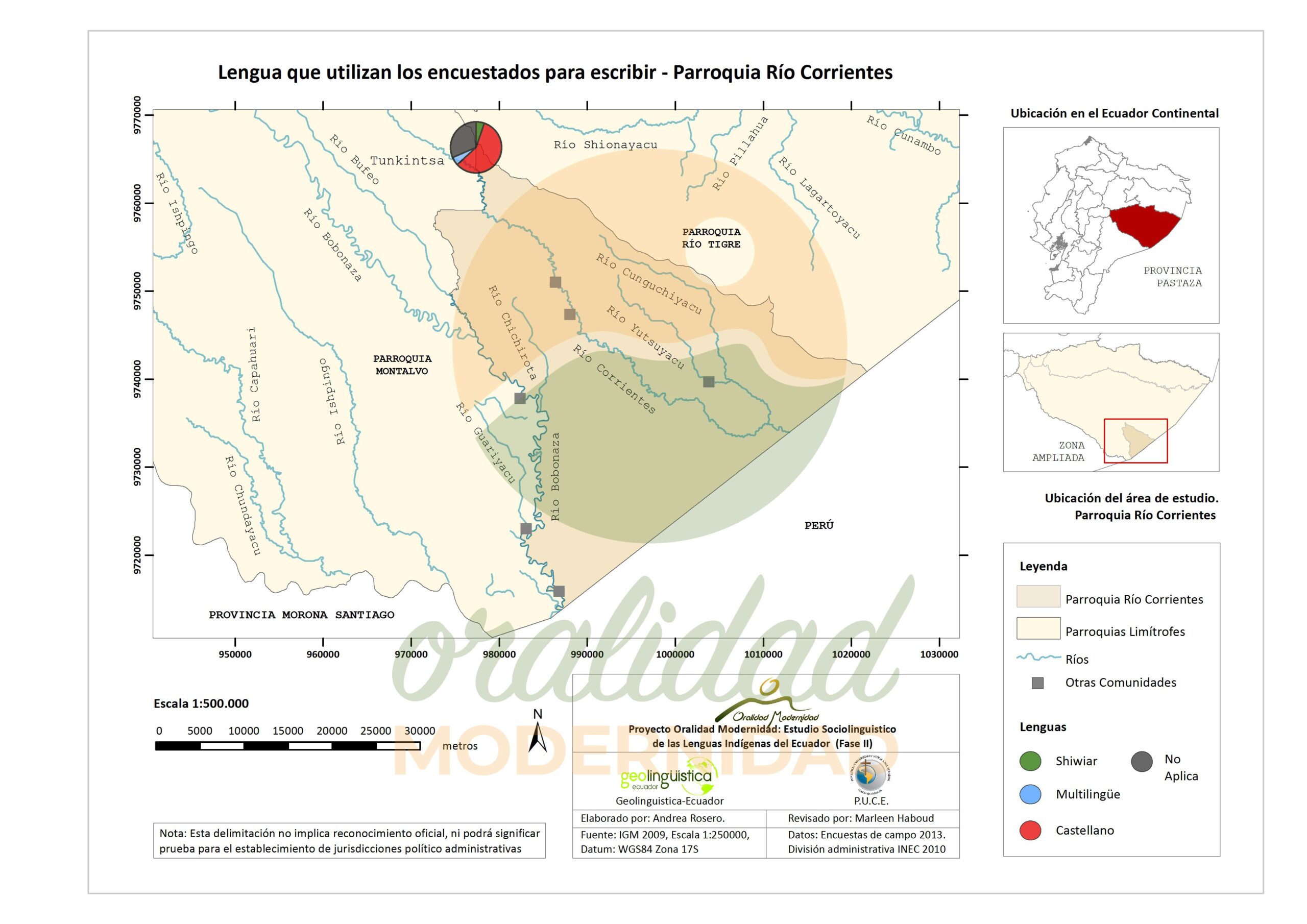 Cite: Haboud, M. (2013). Mapa de la lengua que utilizan los encuestados de la nacionalidad Shiwiar para escribir – Parroquia Río Corrientes. Programa Oralidad Modernidad/GeolingüísticaEcuador. https://oralidadmodernidad.org/parroquia-rio-corrientes/