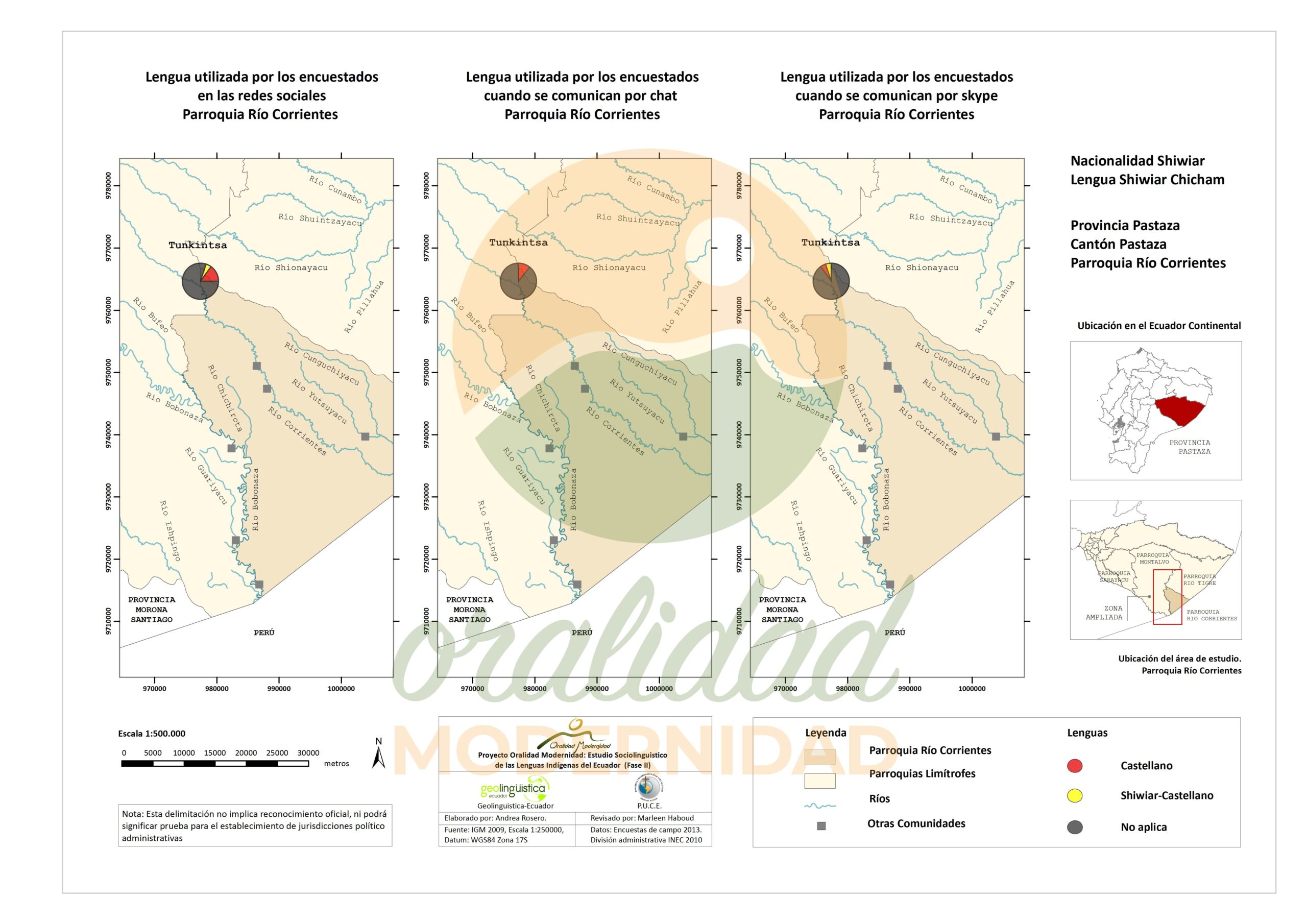 Cite: Haboud, M. (2013). Mapa de la lengua utilizada por los encuestados de la nacionalidad Shiwiar en redes sociales, cuando se comunican por chat y cuando se comunican por skype – Parroquia Río Corrientes. Programa Oralidad Modernidad/GeolingüísticaEcuador. https://oralidadmodernidad.org/parroquia-rio-corrientes/