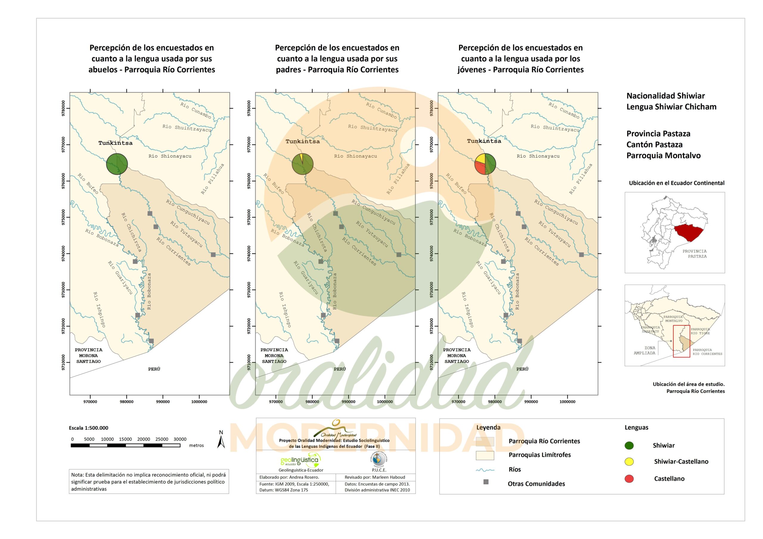 Cite: Haboud, M. (2013). Mapa de la percepción de los encuestados de la nacionalidad Shiwiar en cuanto a la lengua usada por sus abuelos, por sus padres y por los jóvenes en la parroquia Río Corrientes. Programa Oralidad Modernidad/GeolingüísticaEcuador. https://oralidadmodernidad.org/parroquia-rio-corrientes/