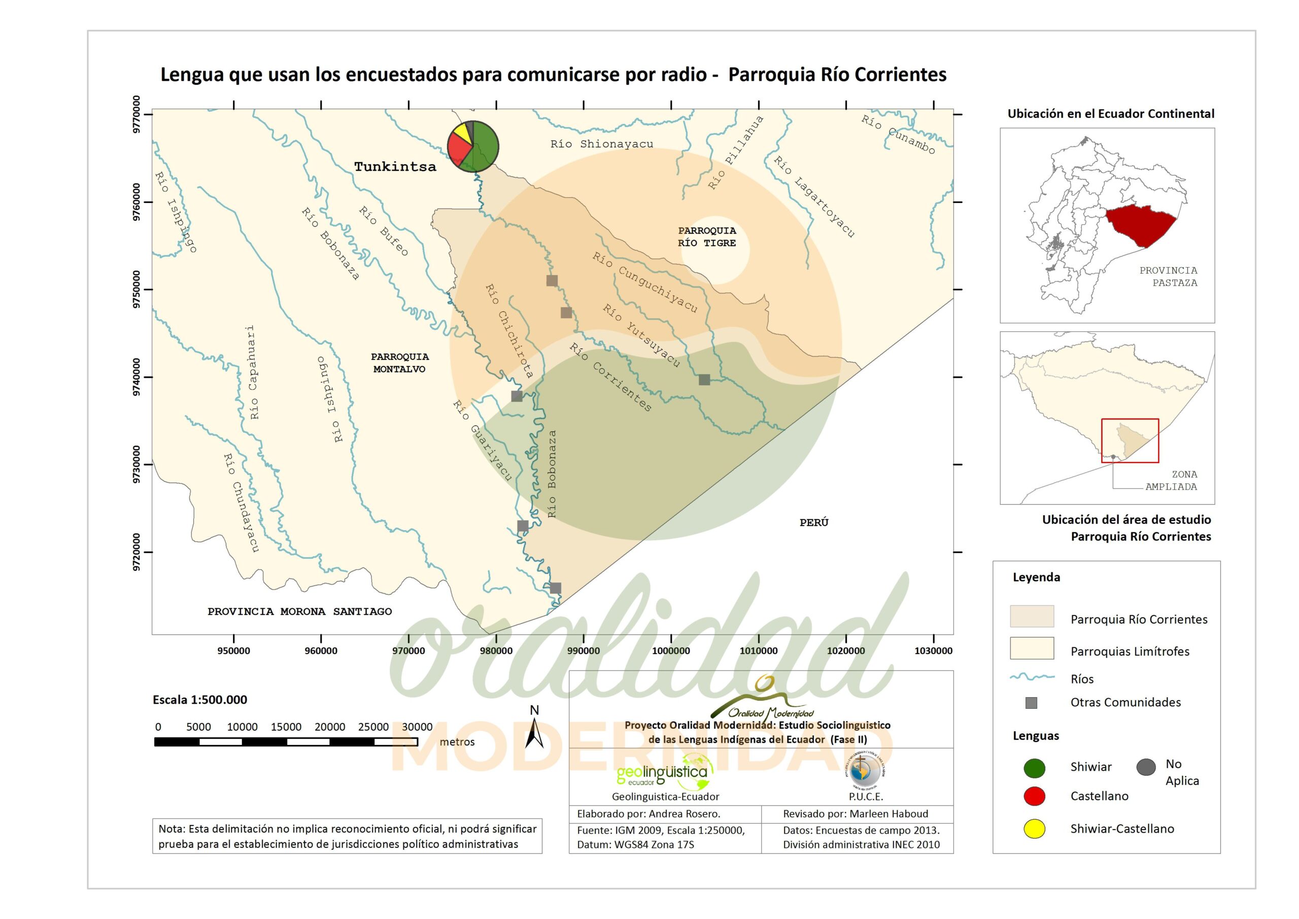 Cite: Haboud, M. (2013). Mapa de la lengua que usan los encuestados de la nacionalidad Shiwiar para comunicarse por radio – Parroquia Río Corrientes. Programa Oralidad Modernidad/GeolingüísticaEcuador. https://oralidadmodernidad.org/parroquia-rio-corrientes/