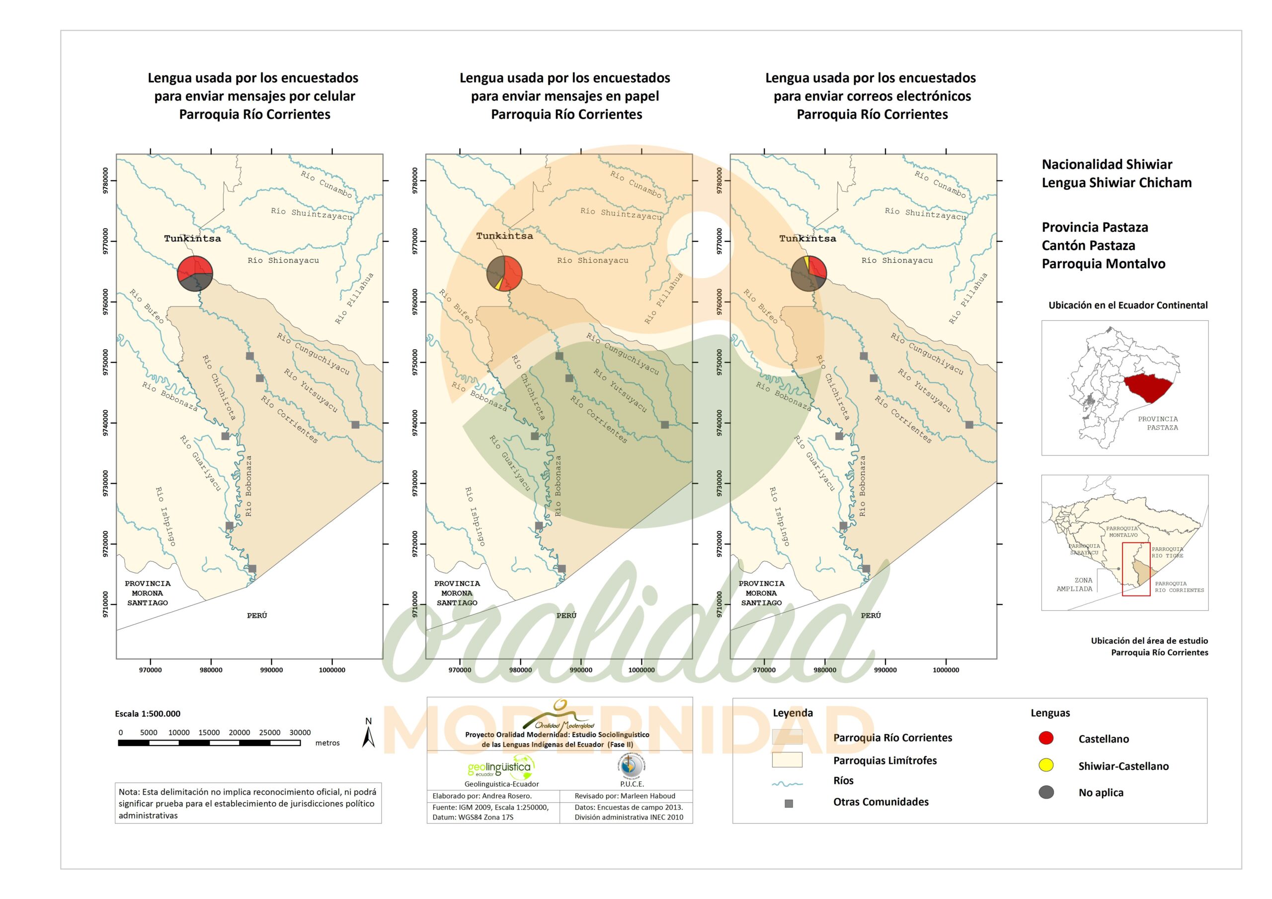 Cite: Haboud, M. (2013). Mapa de la lengua usada por los encuestados de la nacionalidad Shiwiar para enviar mensajes por celular, para enviar mensajes en papel y para enviar correos electrónicos – Parroquia Río Corrientes. Programa Oralidad Modernidad/GeolingüísticaEcuador. https://oralidadmodernidad.org/parroquia-rio-corrientes/