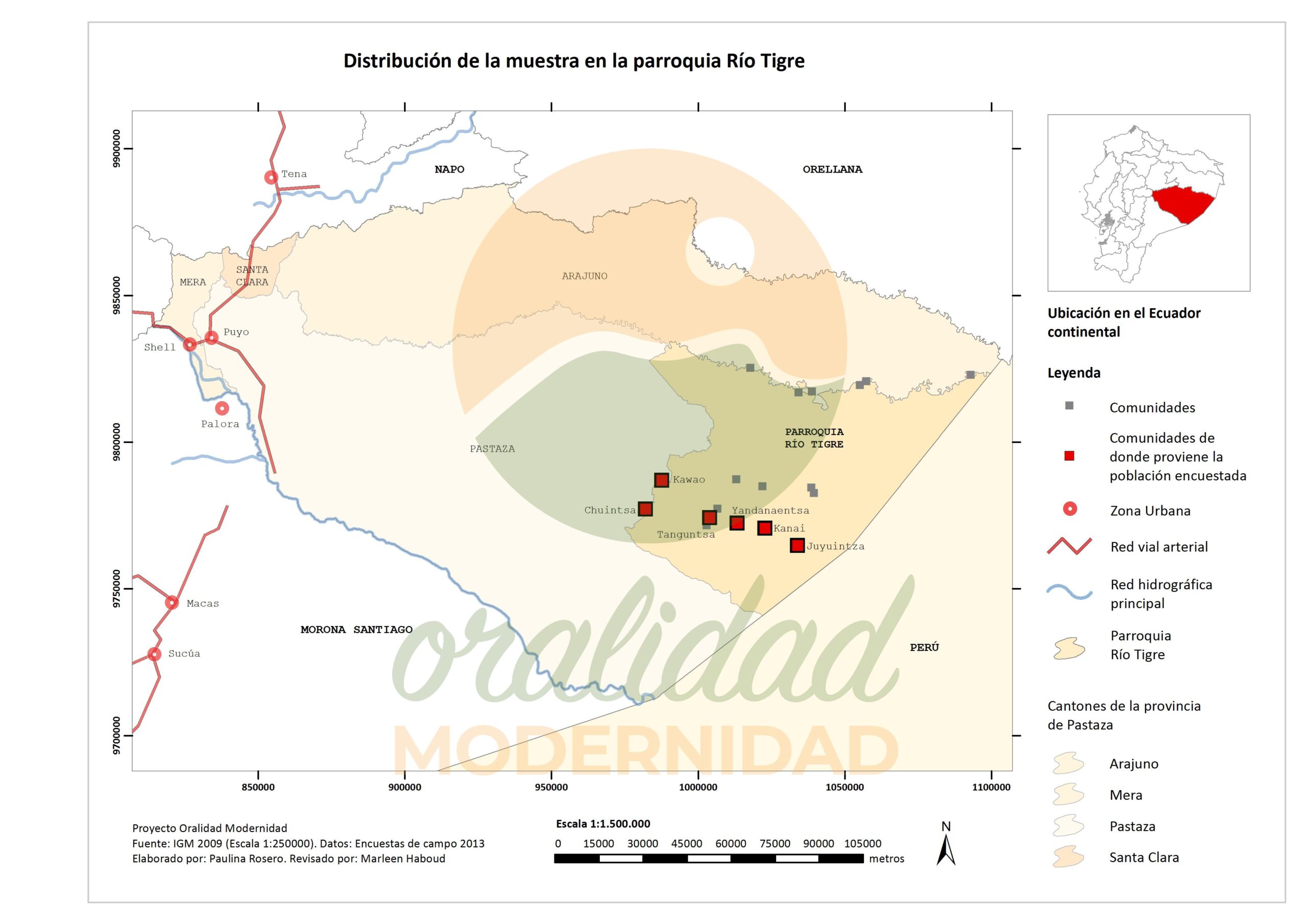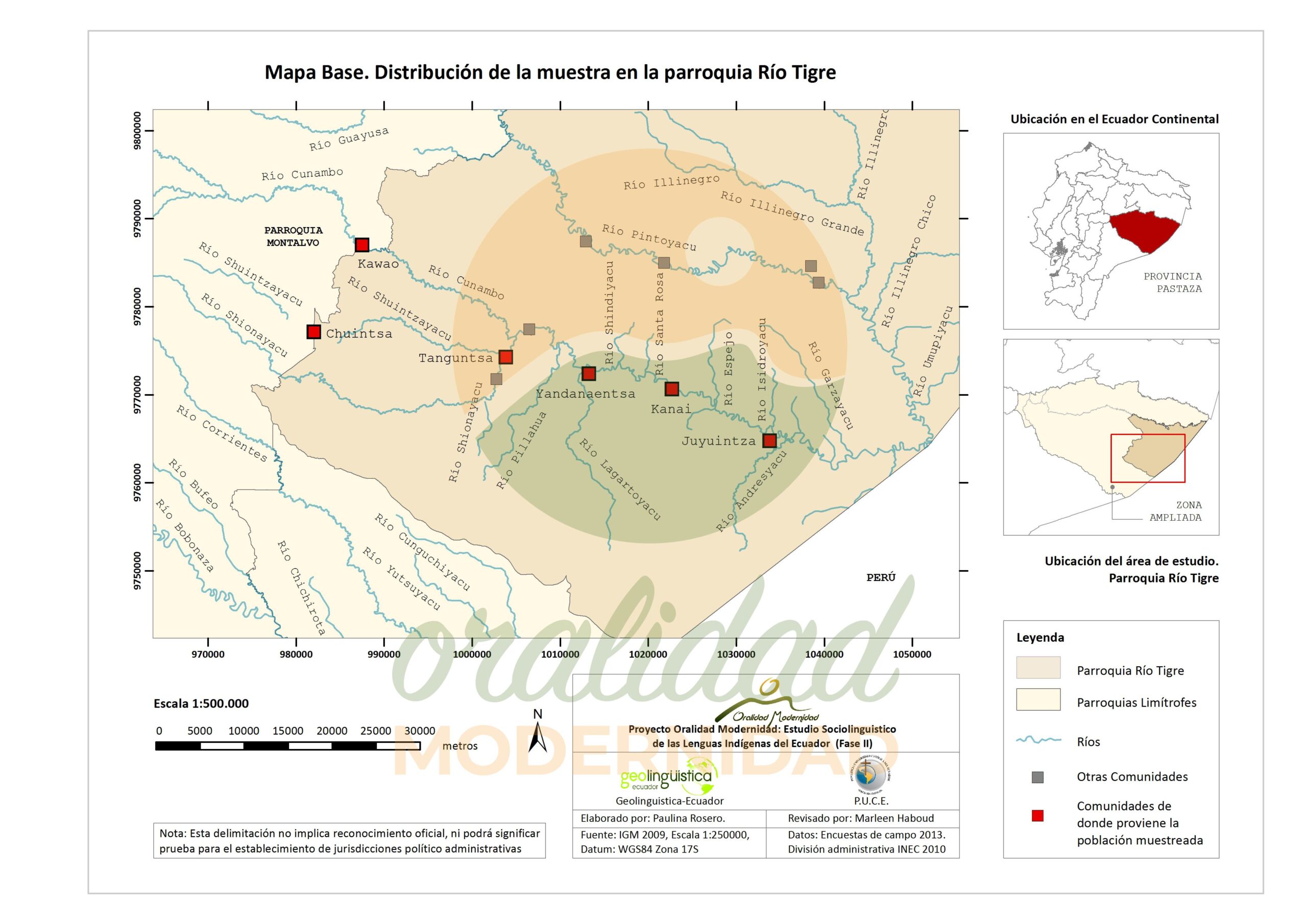 Cite: Haboud, M. (2013). Acercamiento del mapa de la distribución de la muestra de los encuestados de la nacionalidad Shiwiar en la parroquia Río Tigre. Programa Oralidad Modernidad/GeolingüísticaEcuador. https://oralidadmodernidad.org/parroquia-rio-tigre/