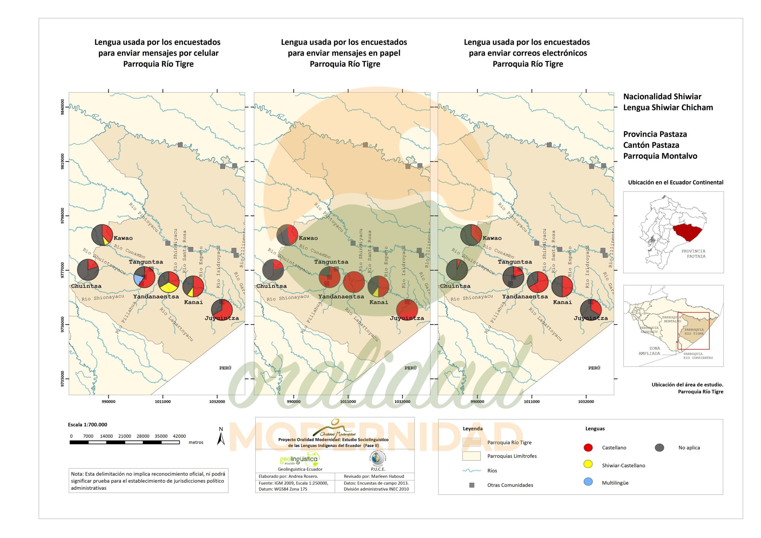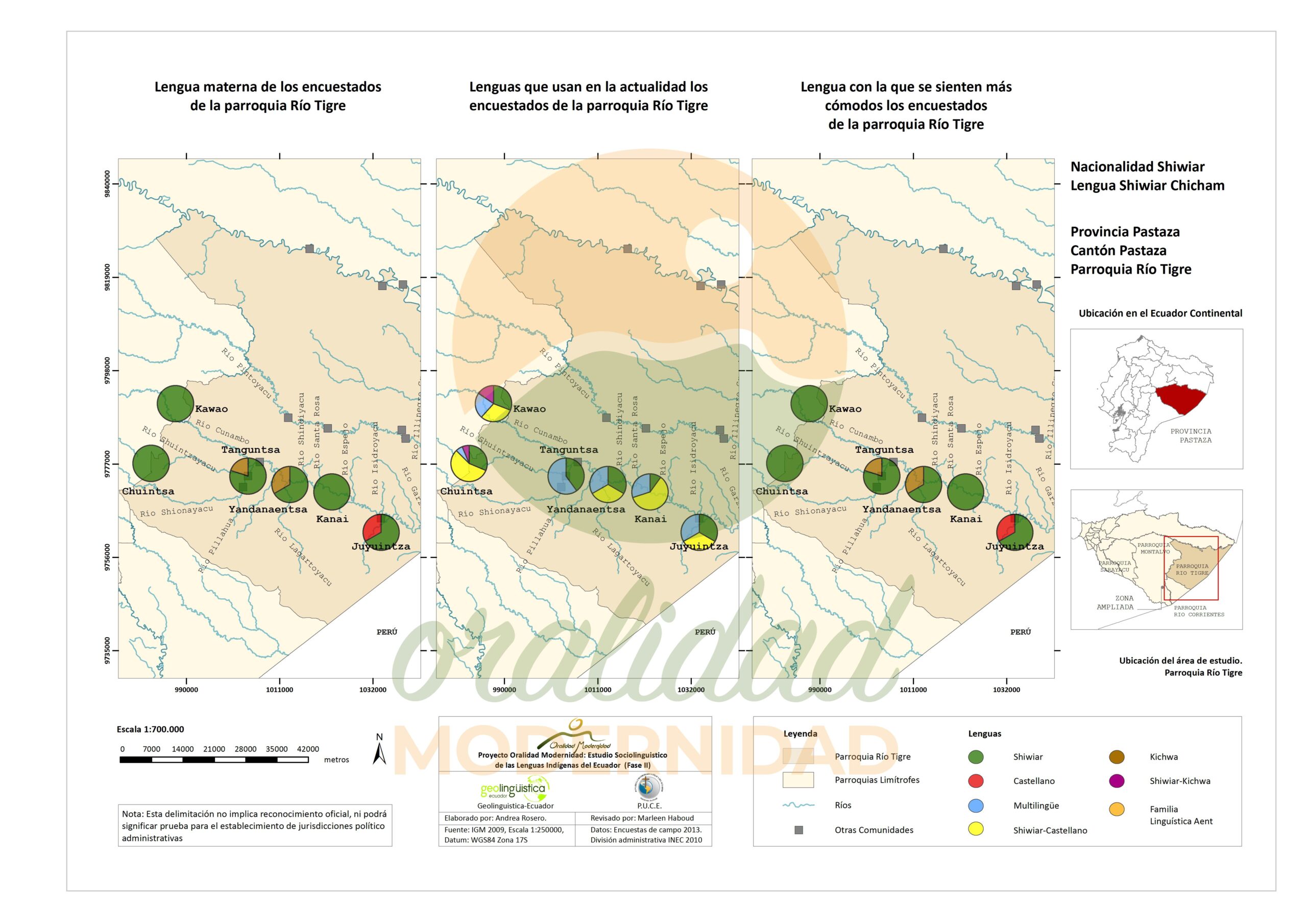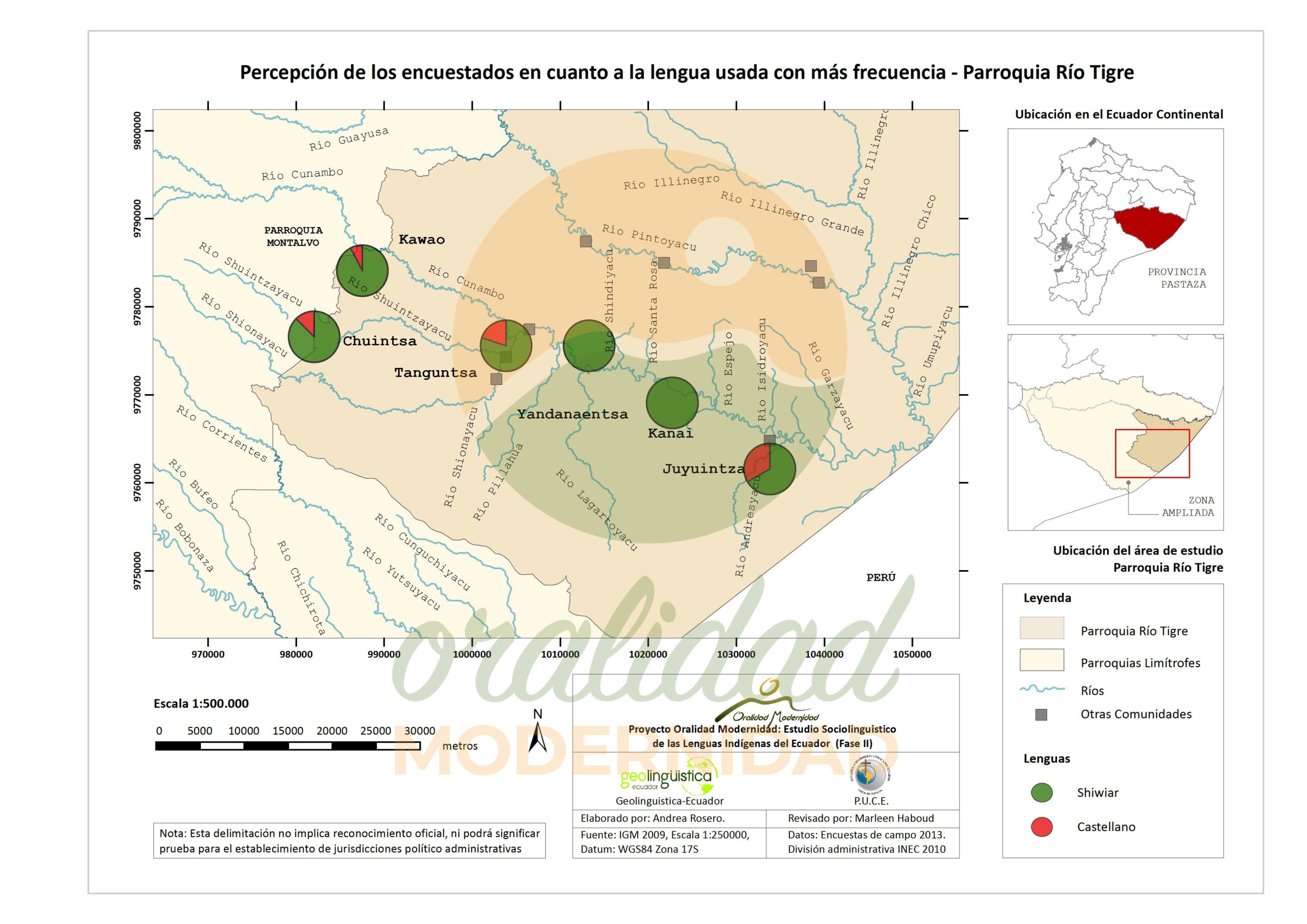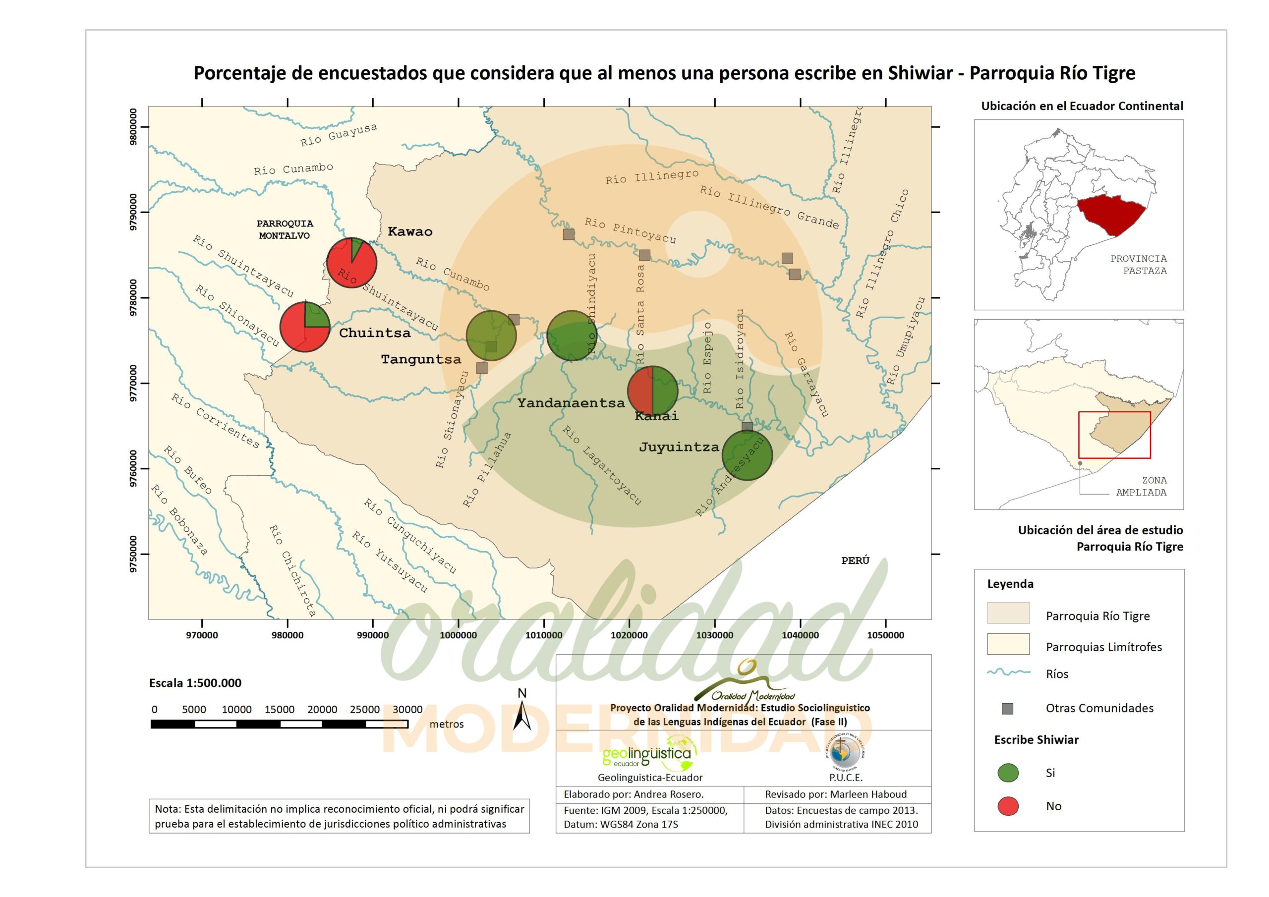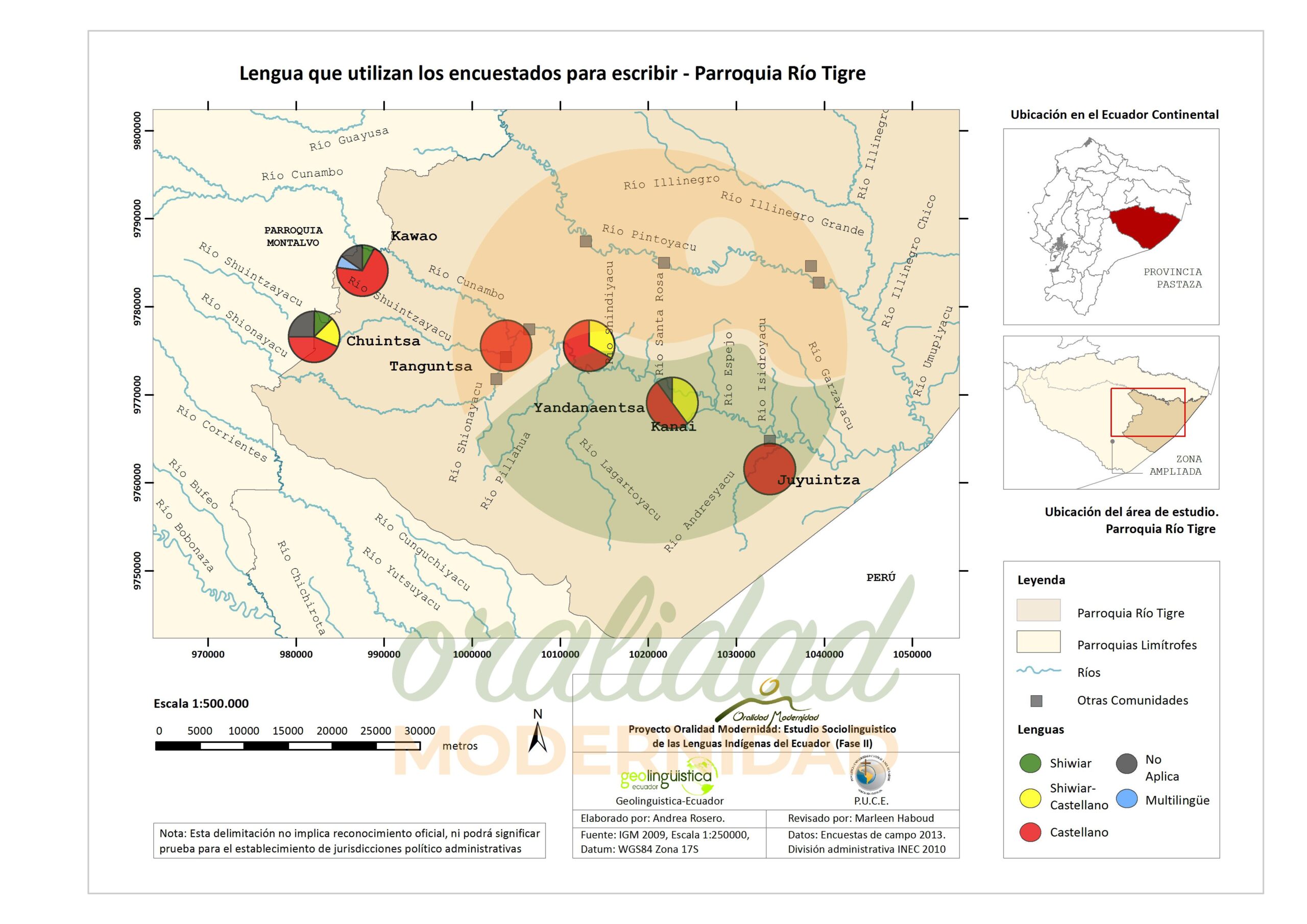Cite: Haboud, M. (2013). Mapa de la lengua que utilizan los encuestados de la nacionalidad Shiwiar para escribir – Parroquia Río Tigre. Programa Oralidad Modernidad/GeolingüísticaEcuador. https://oralidadmodernidad.org/parroquia-rio-tigre/