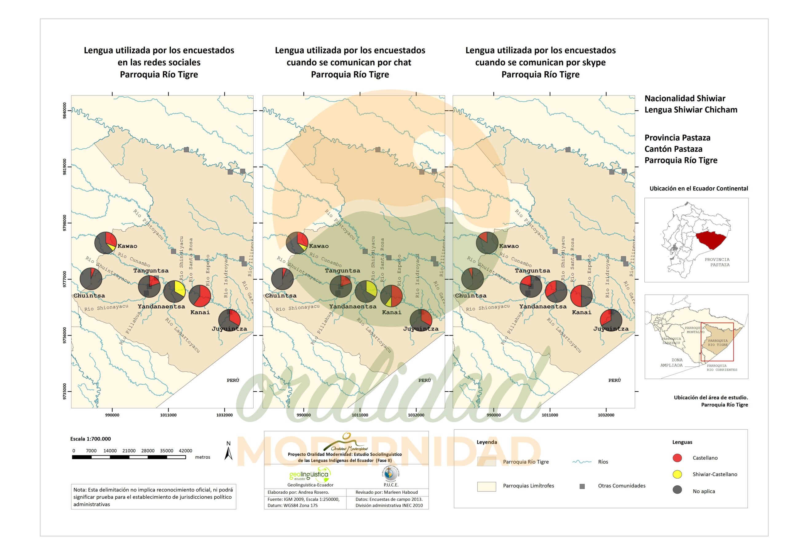 Cite: Haboud, M. (2013). Mapa de la lengua utilizada por los encuestados de la nacionalidad Shiwiar en las redes sociales, cuando se comunican por chat y cuando se comunican por skype – Parroquia Río Tigre. Programa Oralidad Modernidad/GeolingüísticaEcuador. https://oralidadmodernidad.org/parroquia-rio-tigre/
