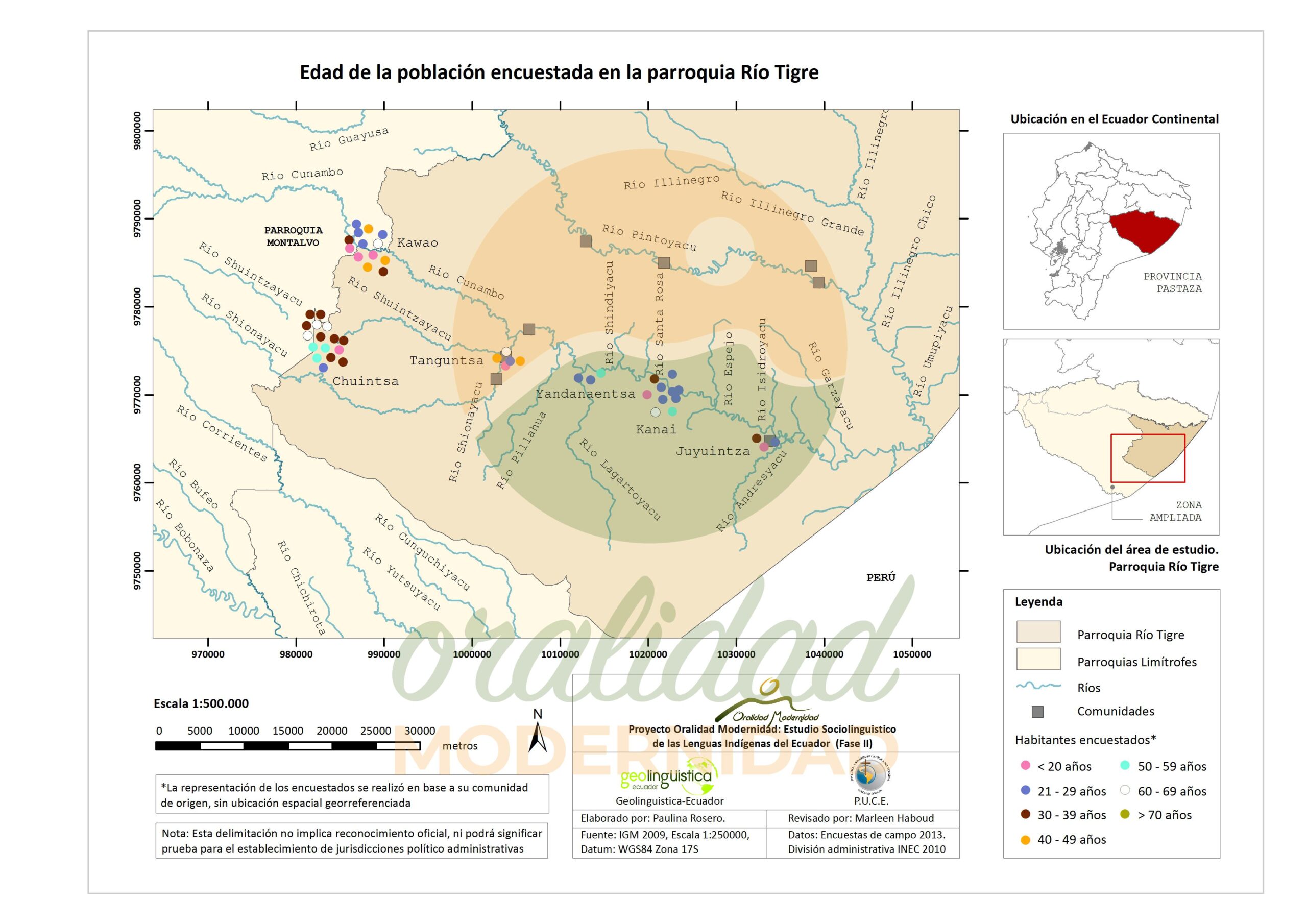 Cite: Haboud, M. (2013). Mapa de la edad de la población encuestada de la nacionalidad Shiwiar en la parroquia Río Tigre. Programa Oralidad Modernidad/GeolingüísticaEcuador. https://oralidadmodernidad.org/parroquia-rio-tigre/