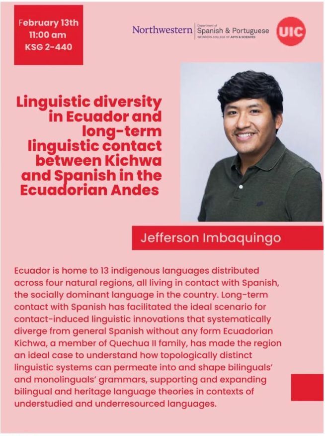 Jefferson Imbaquingo-Ramón, doctorando en la Universidad de Illinois Chicago y miembro de Oralidad Modernidad, presentará “Linguistic Diversity in Ecuador and long-term linguistic contact between Kichwa and Spanish in the Ecuadorian Andes” en la Universidad de Northwestern en Evanston, Illinois el 13 de febrero de 2026.