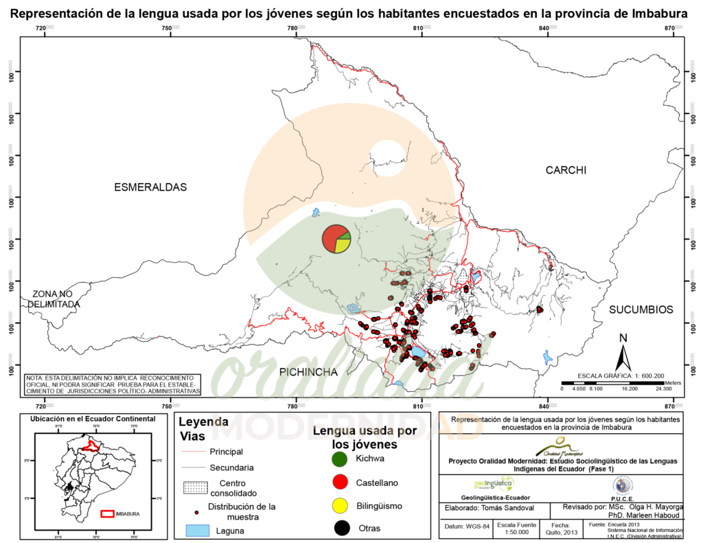 Cite: Haboud, M. (2013). Mapa de representación de la lengua usada por los jóvenes según los habitantes encuestados en la provincia de Imbabura. Programa Oralidad Modernidad/GeolingüísticaEcuador. https://oralidadmodernidad.org/provincia-imbabura/