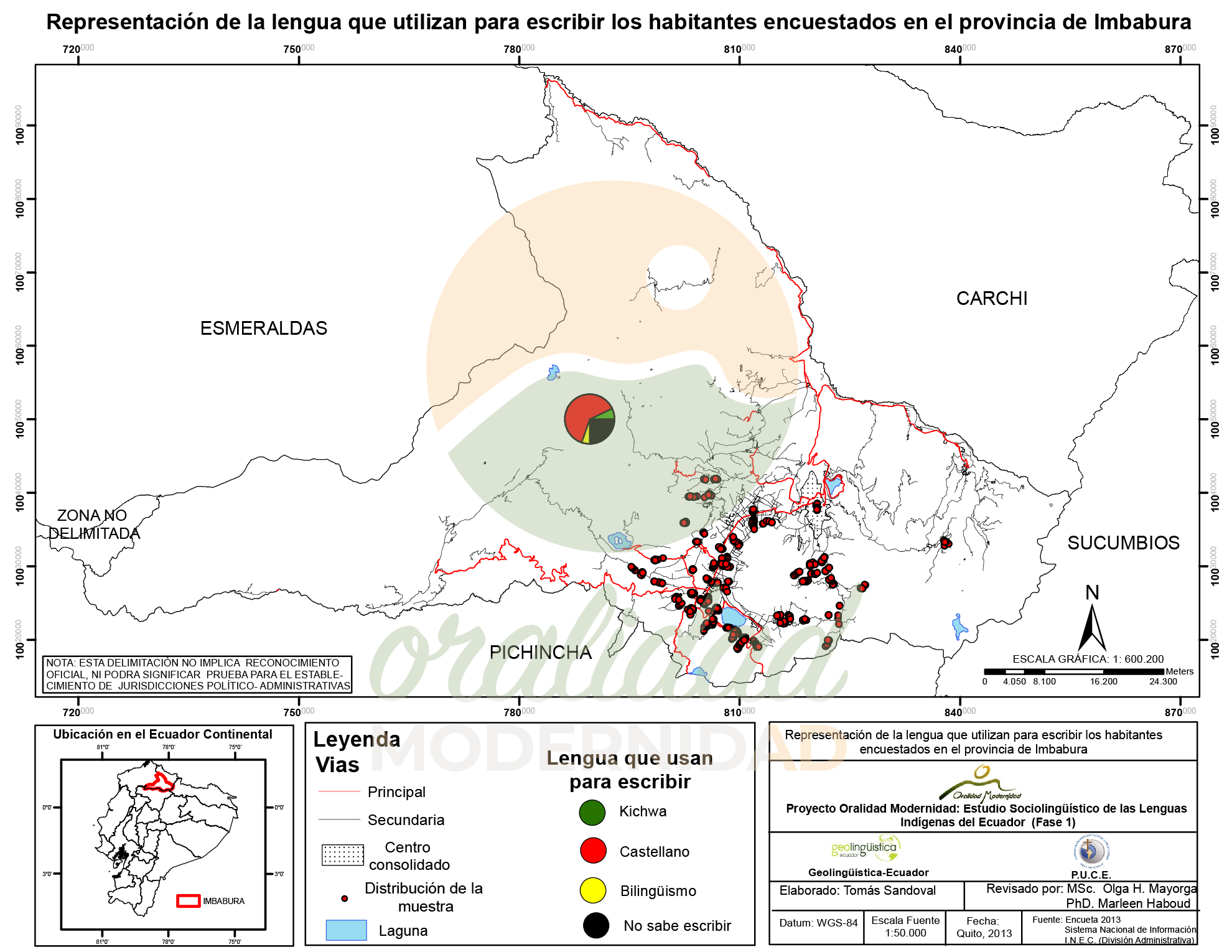 Cite: Haboud, M. (2013). Mapa de representación de la lengua que utilizan para escribir los habitantes encuestados en la provincia de Imbabura. Programa Oralidad Modernidad/GeolingüísticaEcuador. https://oralidadmodernidad.org/provincia-imbabura/
