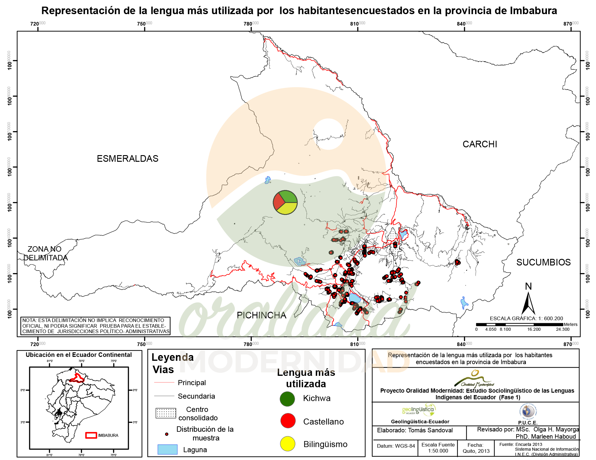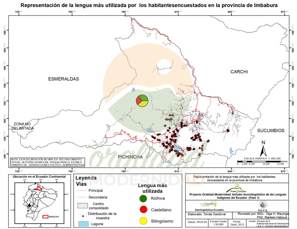 Cite: Haboud, M. (2013). Mapa de representación de la lengua más utilizada por los habitantes encuestados en la provincia de Imbabura. Programa Oralidad Modernidad/GeolingüísticaEcuador. https://oralidadmodernidad.org/provincia-imbabura/
